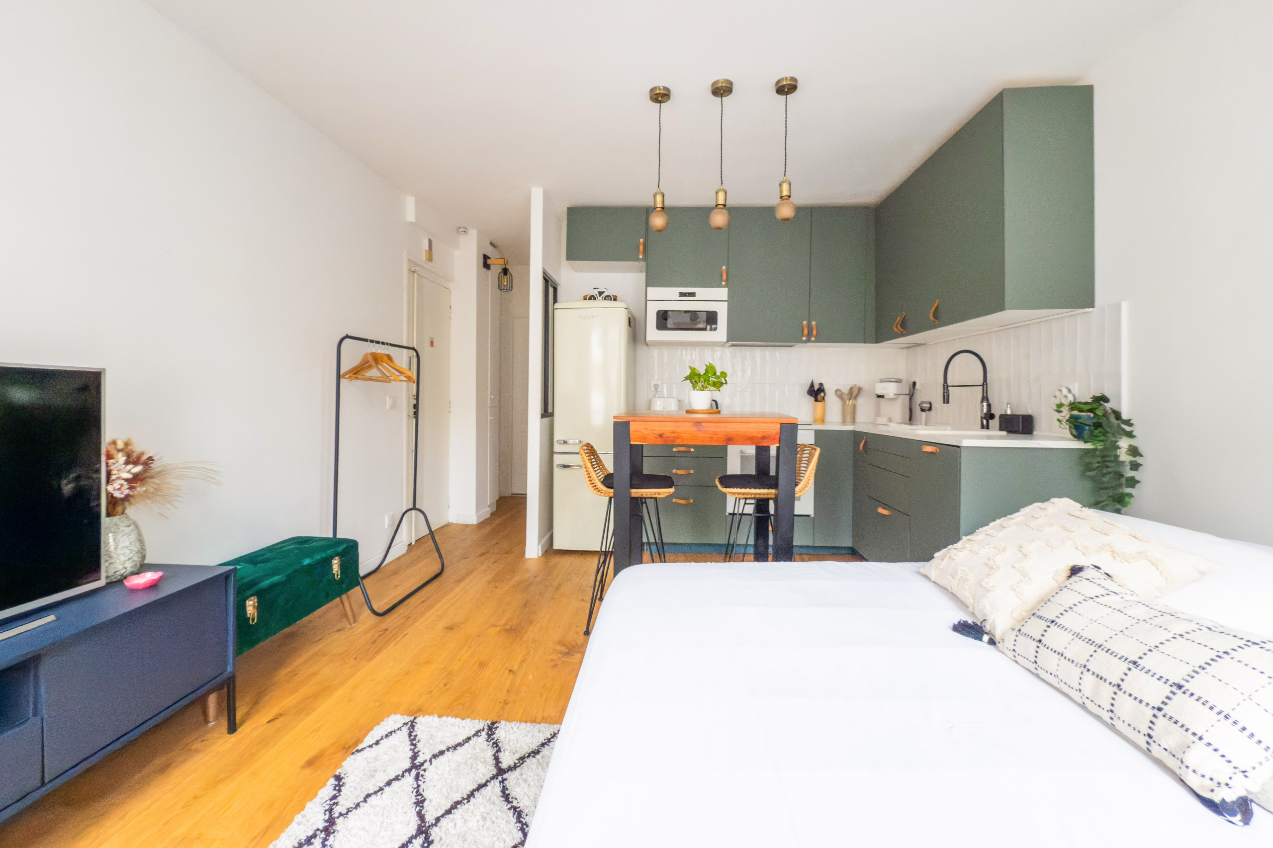 Bem-vindo(a) a este estúdio perfeitamente planejado, ideal para uma estadia confortável no coração de Paris. Localizado no segundo andar de um prédio parisiense típico (sem elevador), ele oferece um ambiente acolhedor e funcional. O estúdio conta com uma cama Queen Size com excelente colchão, garantindo noites tranquilas. O espaço foi otimizado para receber tanto viajantes solos quanto casais ou hóspedes a trabalho.