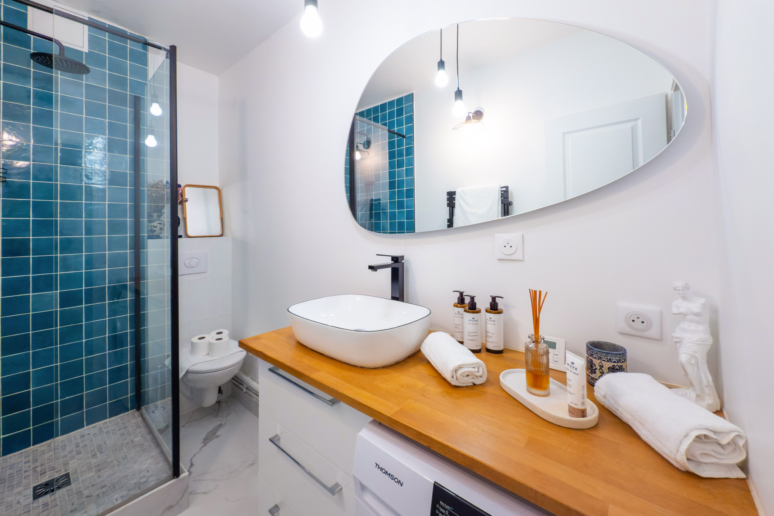 O banheiro com ducha é moderno e funcional, o vaso sanitário é separado e há uma máquina de lavar roupas disponível para maior praticidade durante a estadia.