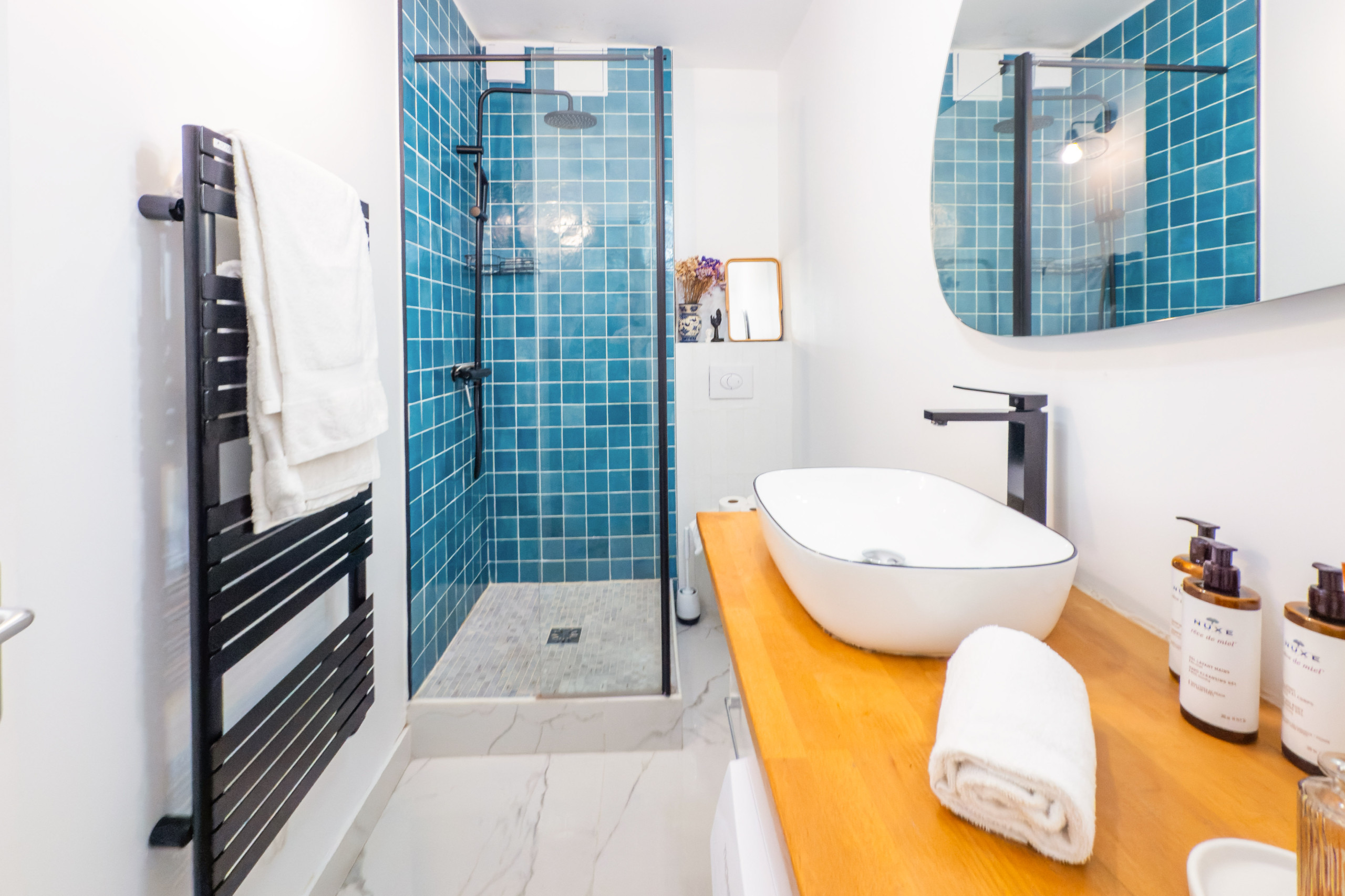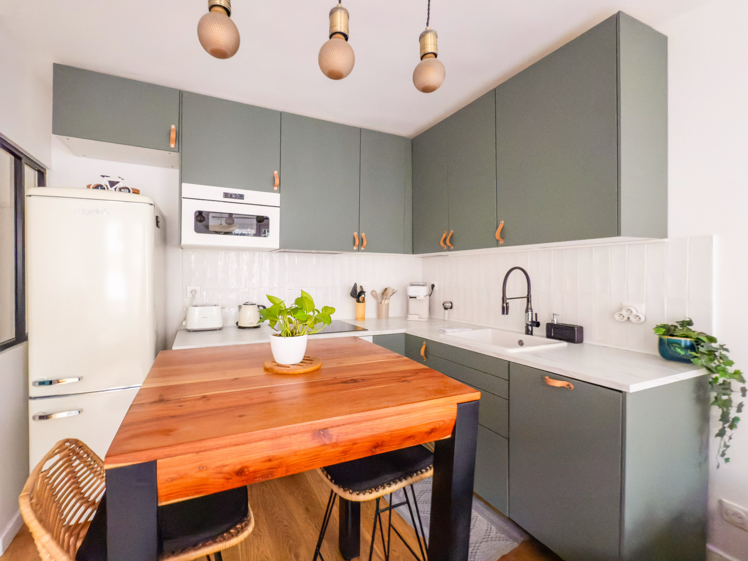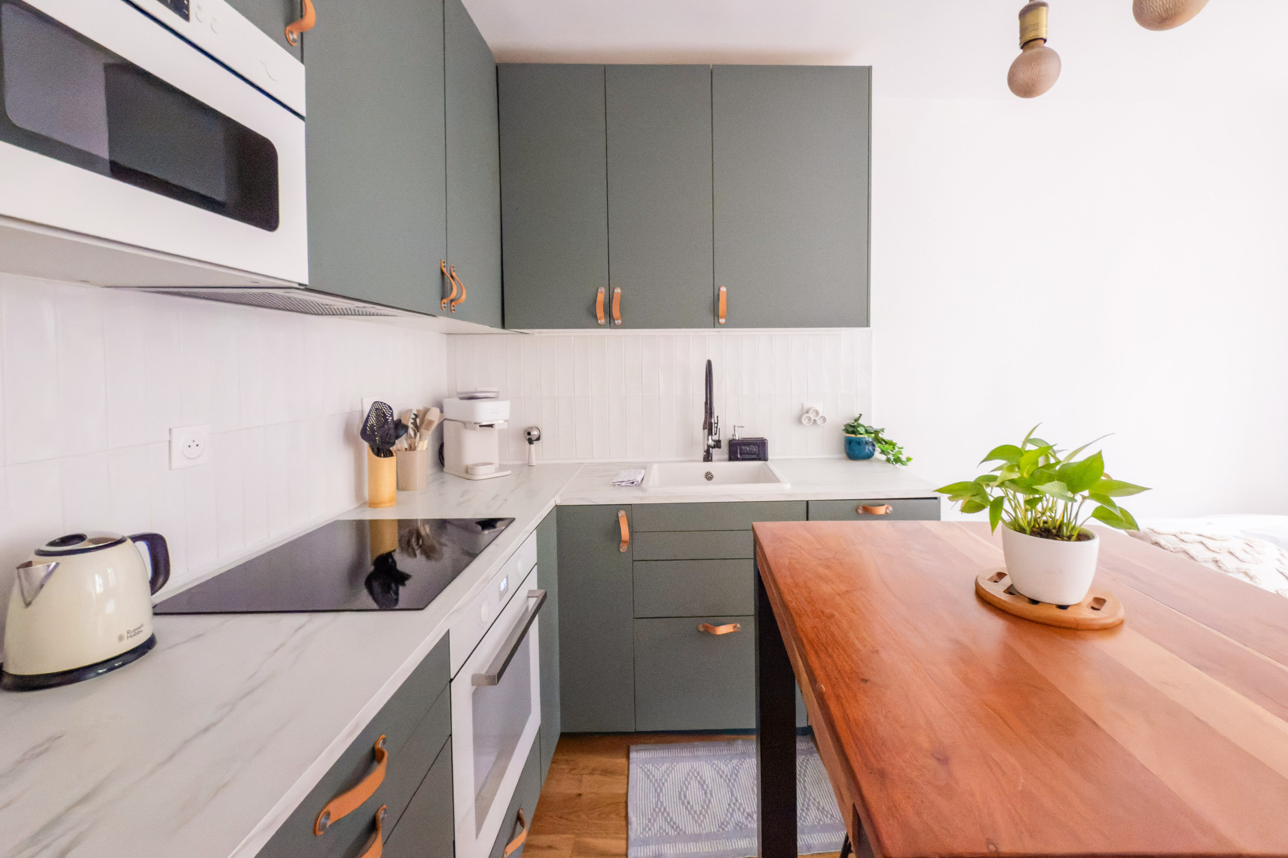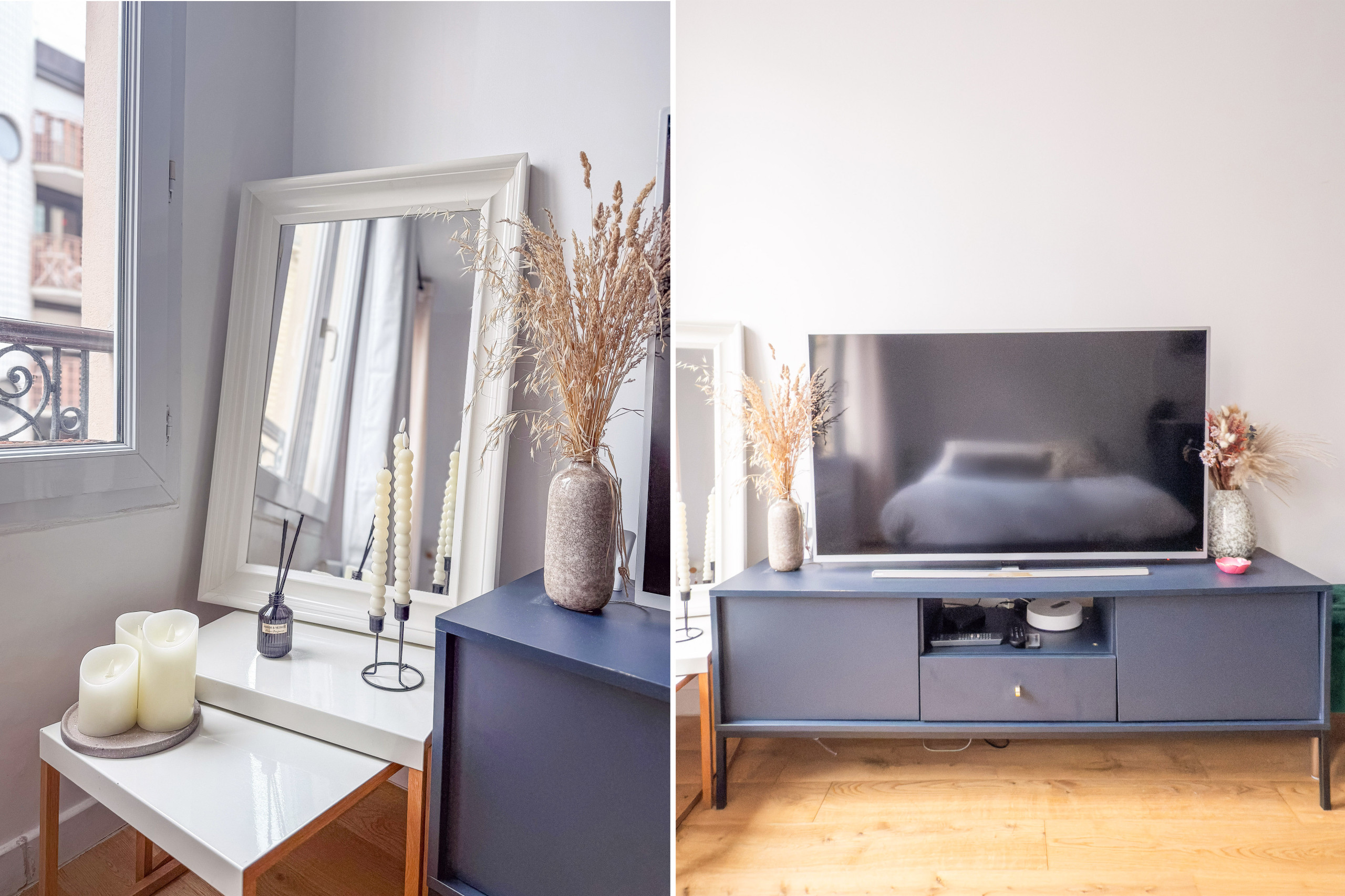 Um espaço de trabalho discreto está localizado no corredor, perfeito para quem precisa trabalhar com tranquilidade. O apartamento também dispõe de uma charmosa varanda com mesa e duas cadeiras, ideal para aproveitar a vista icônica da Torre Eiffel.
