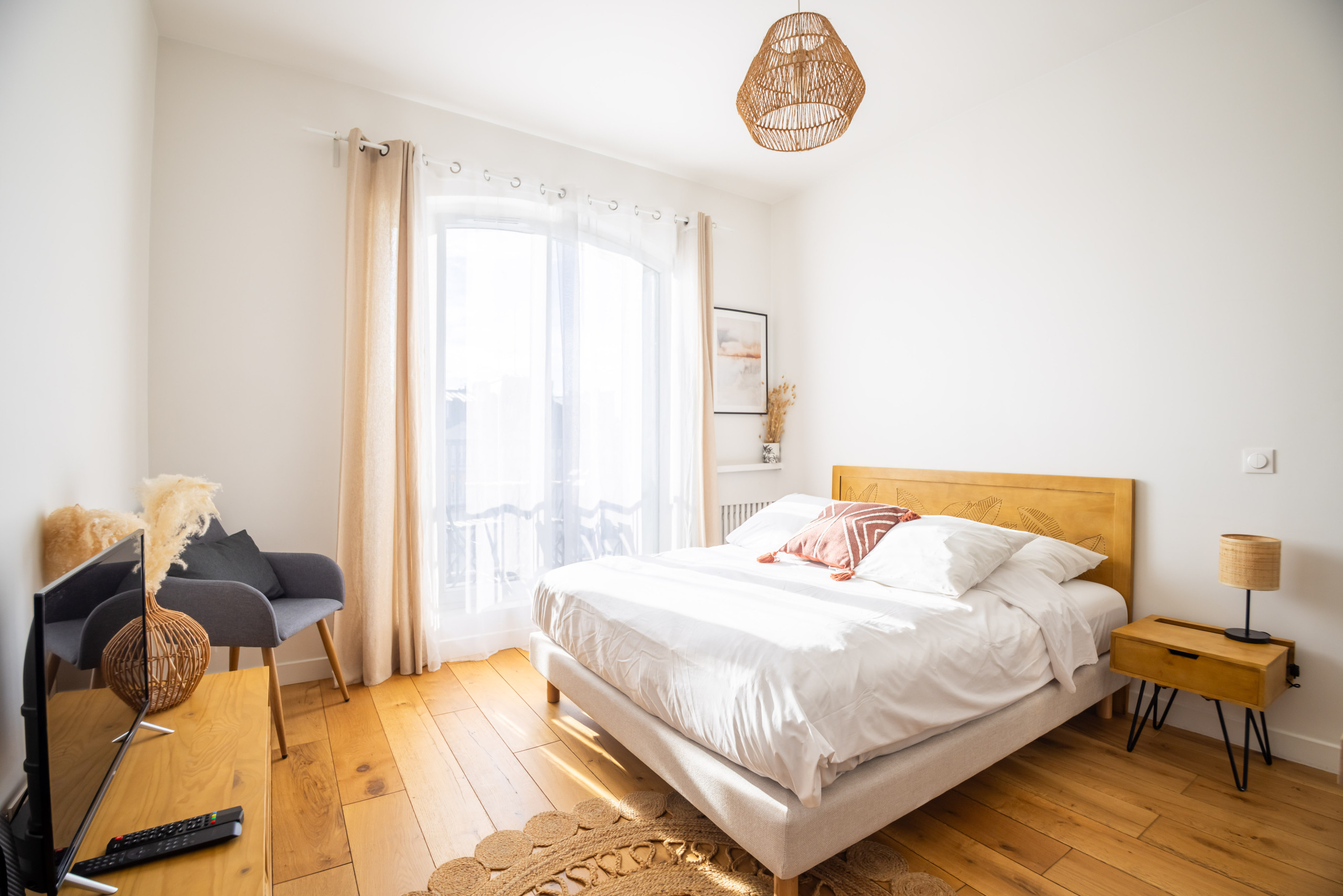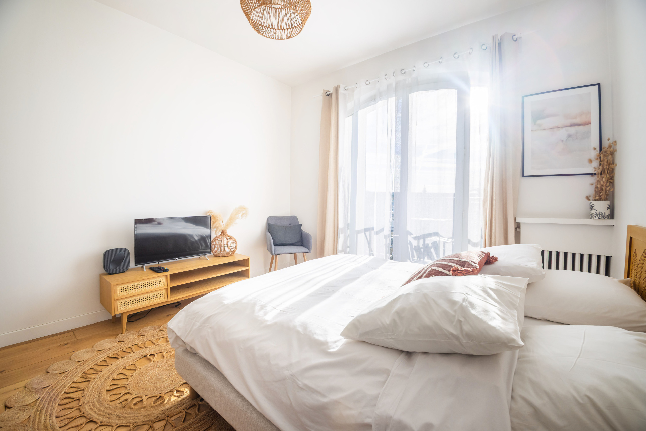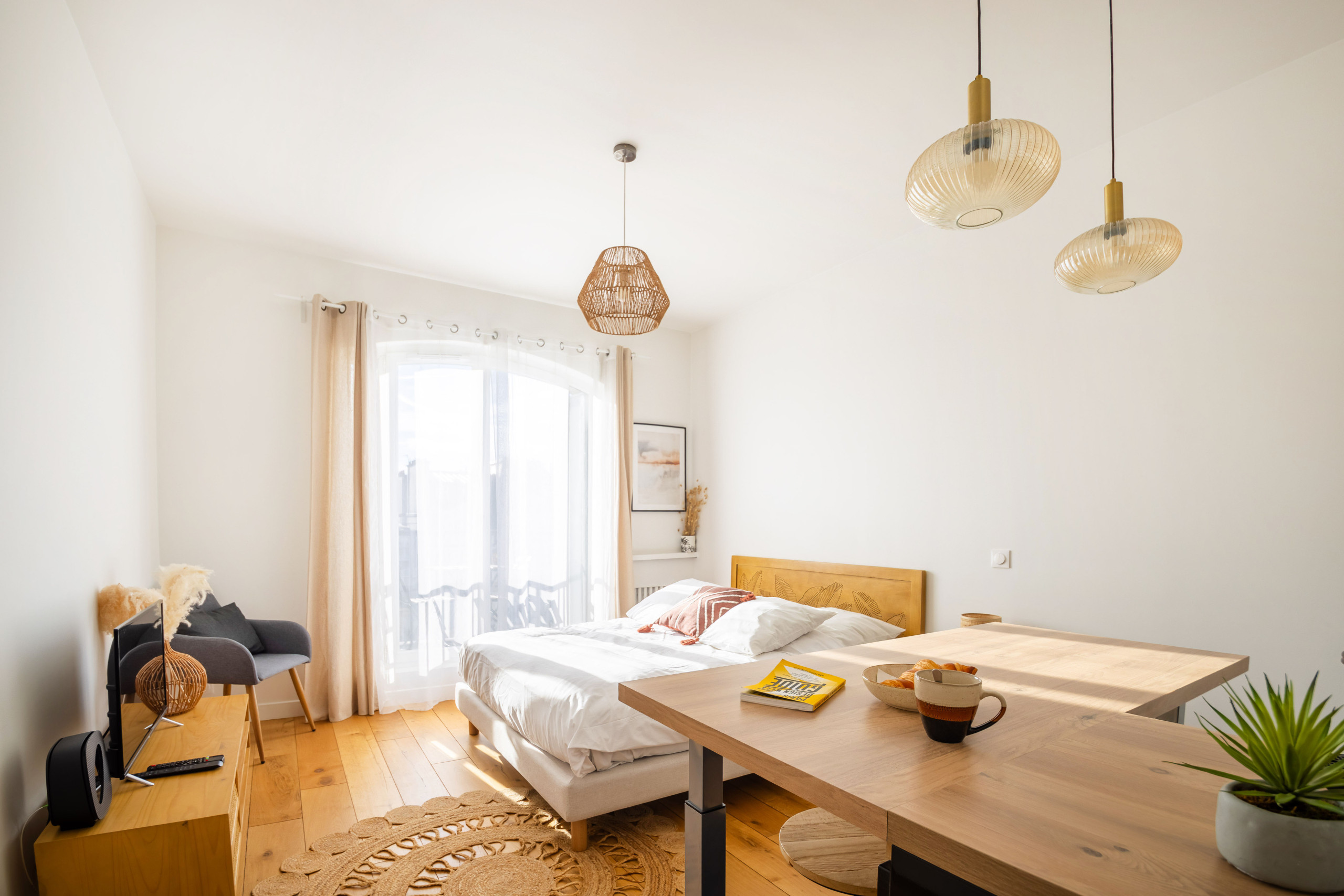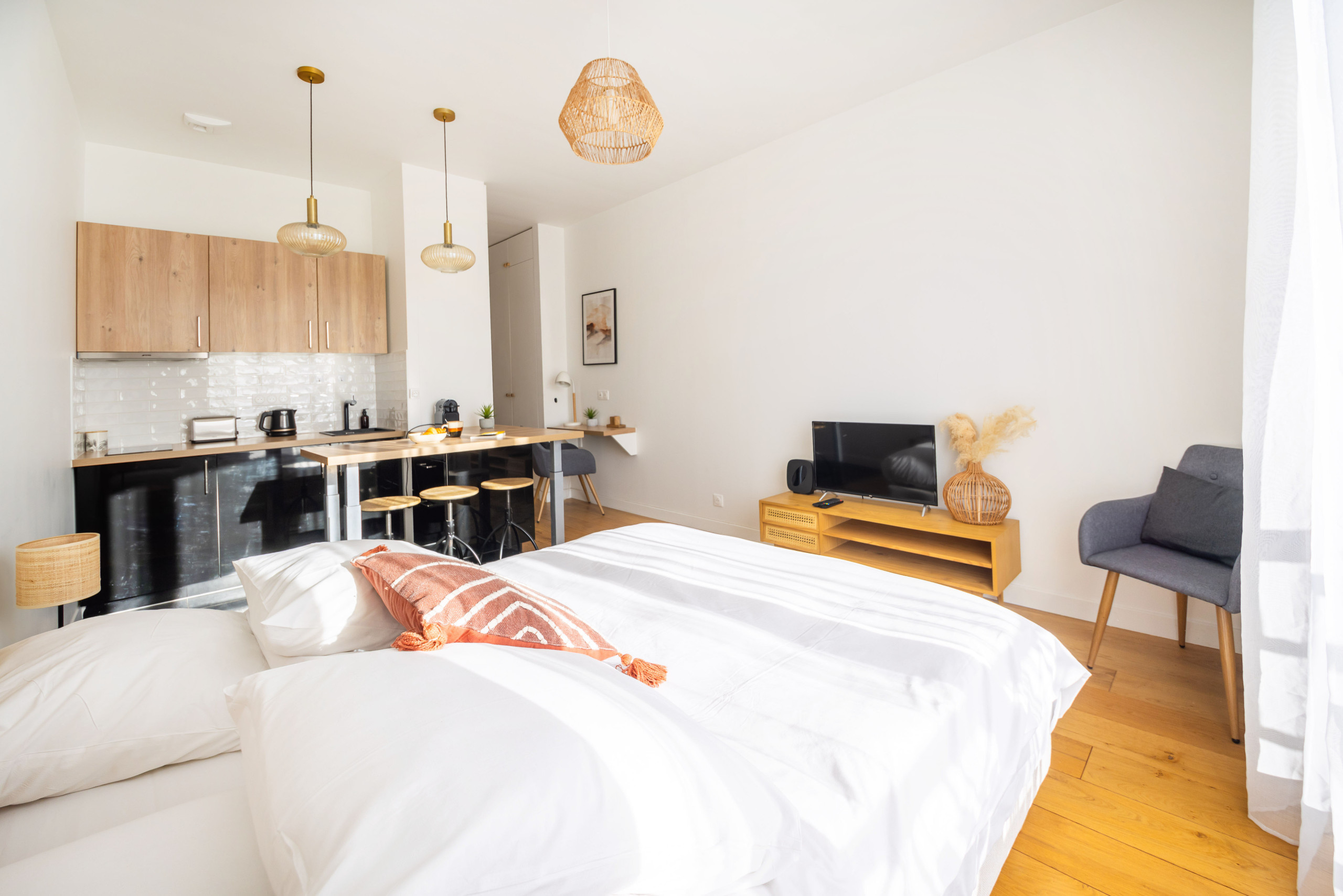 A sala de estar é iluminada, com janelas de vidros duplos voltadas para a rua, um sofá grande para relaxar, uma TV de tela ampla com acesso à Netflix via SFR, uma caixa de som, uma área de trabalho e até um piano vertical Kawai para os amantes da música.