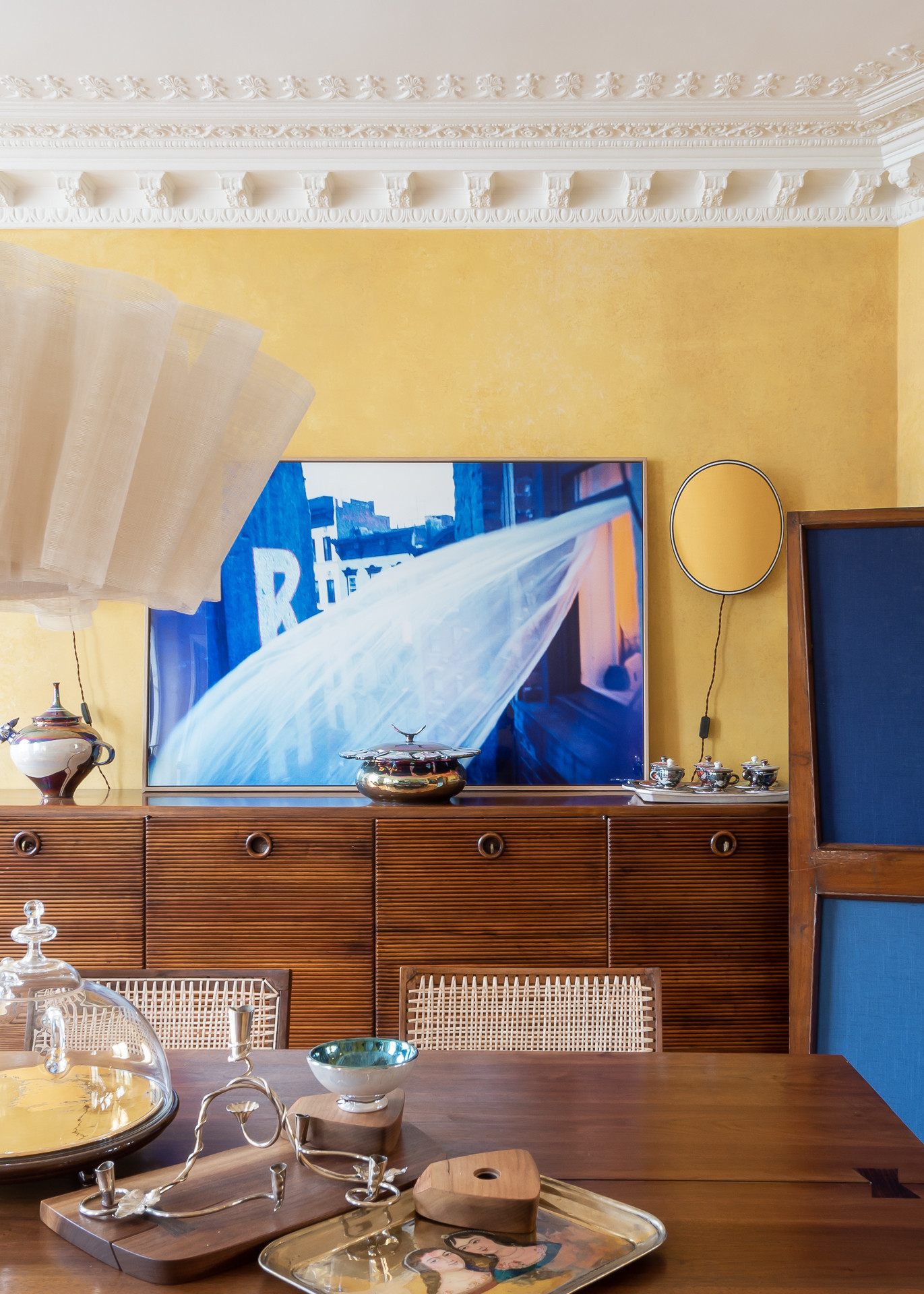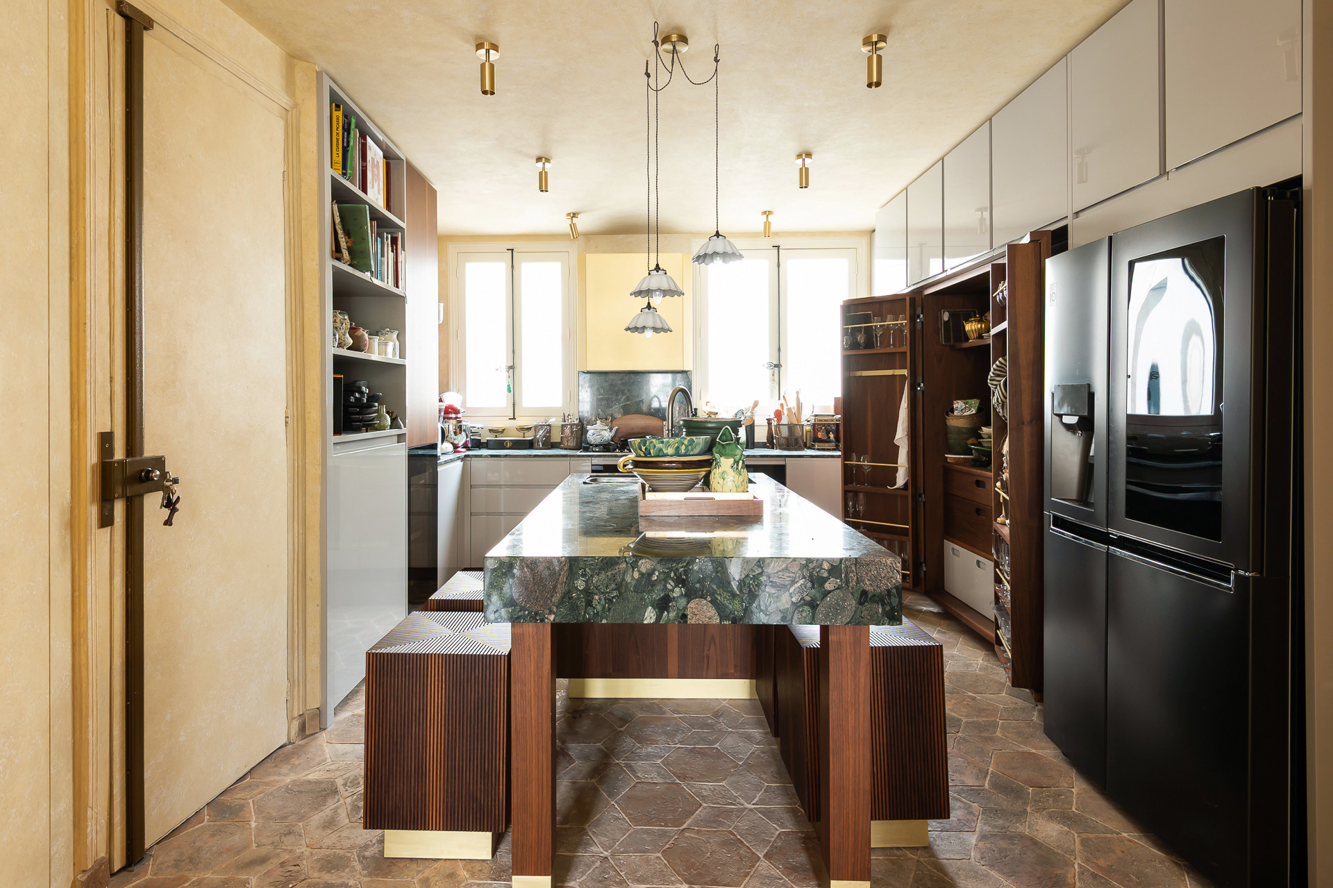 O piso de madeira original, as molduras refinadas, as lareiras decorativas e os paralelepípedos preservados se harmonizam com obras de arte e móveis de design cuidadosamente escolhidos, criando um ambiente sofisticado e inspirador.