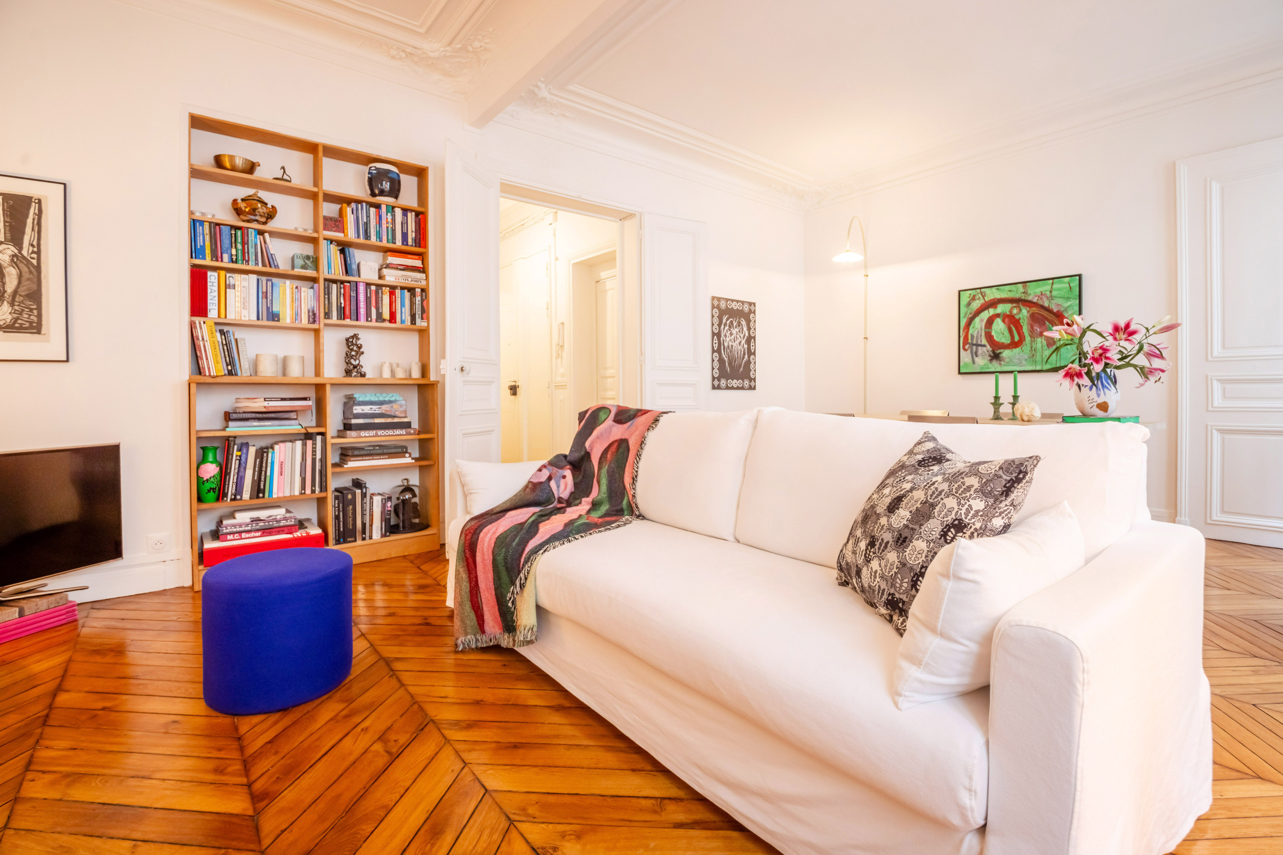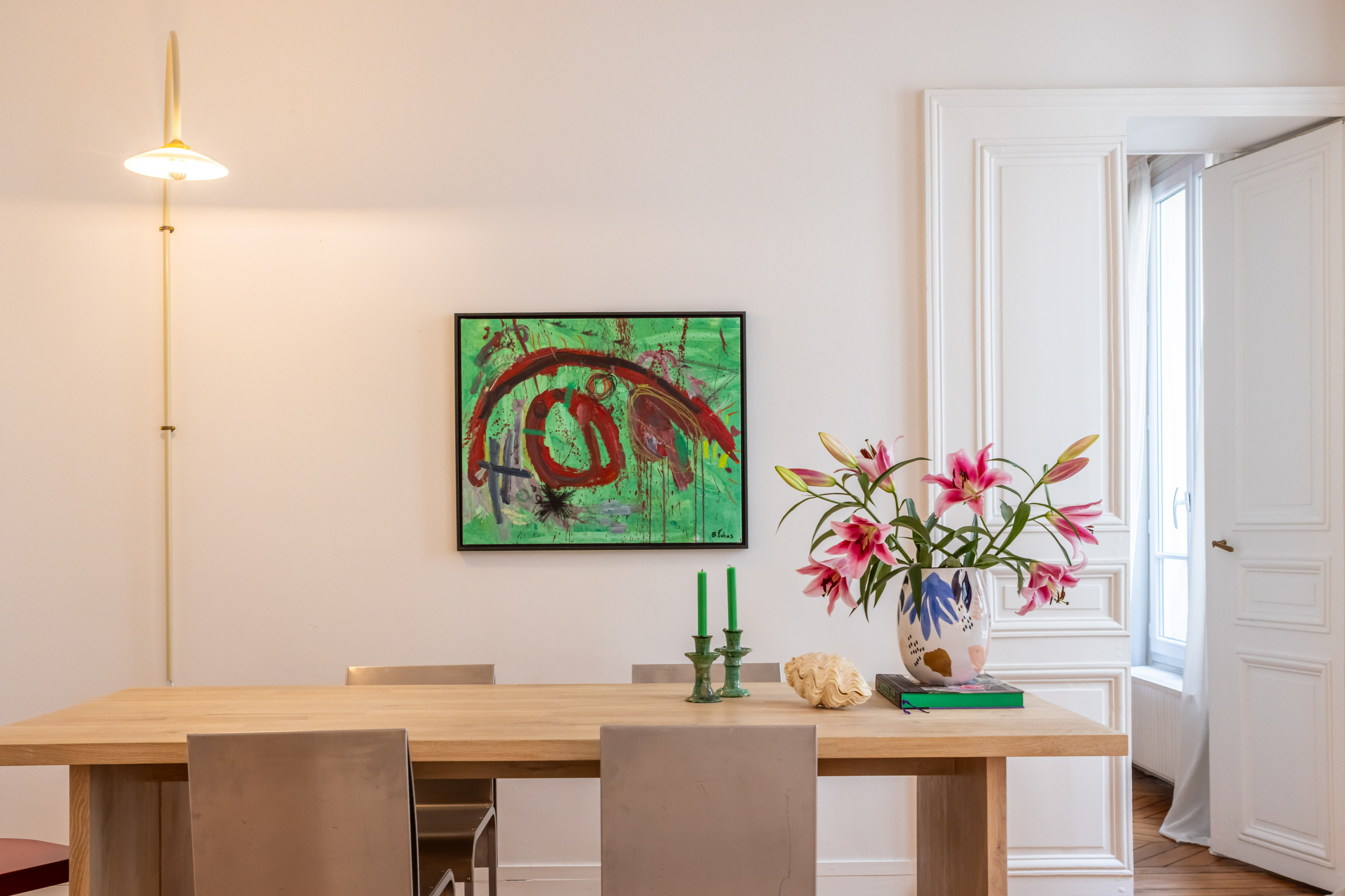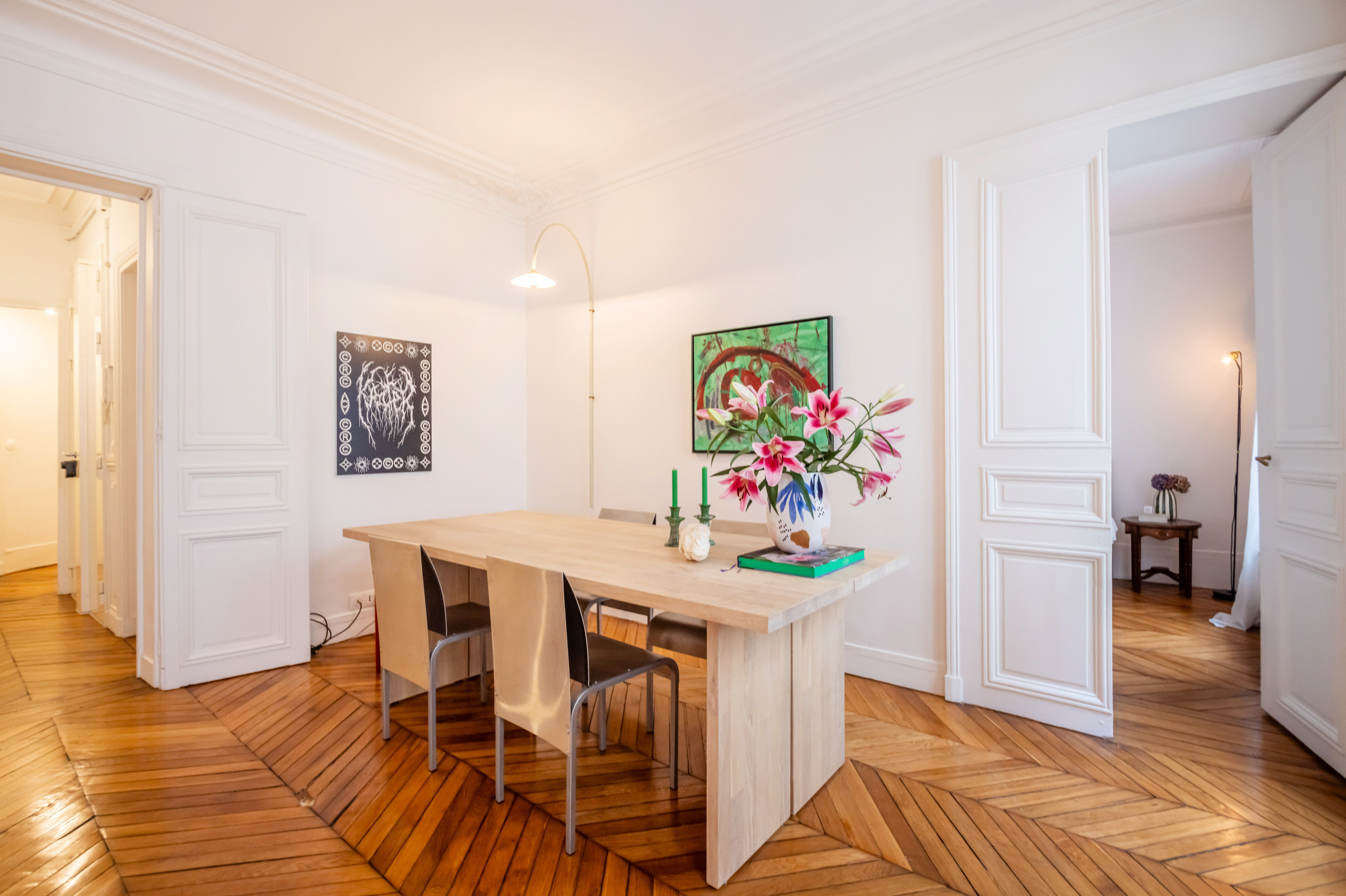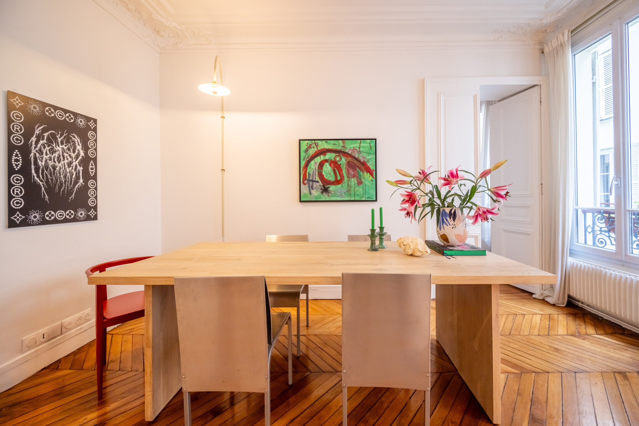 L’espace se distingue par son parquet d’origine, ses moulures élégantes et sa décoration design aux lignes épurées. Le salon, à la fois chaleureux et raffiné, invite à la détente avec son canapé confortable et sa bibliothèque remplie d’ouvrages soigneusement sélectionnés. Une grande table à manger permet d’accueillir jusqu’à six convives, idéale pour partager un repas convivial après une journée de découverte dans la capitale.