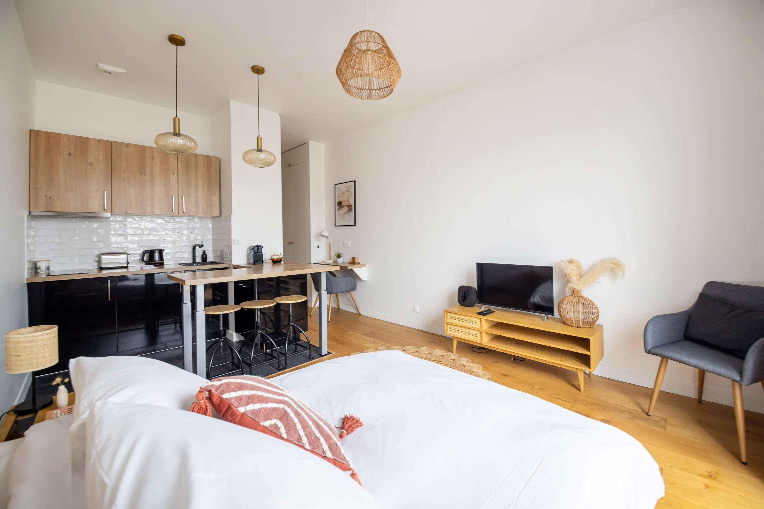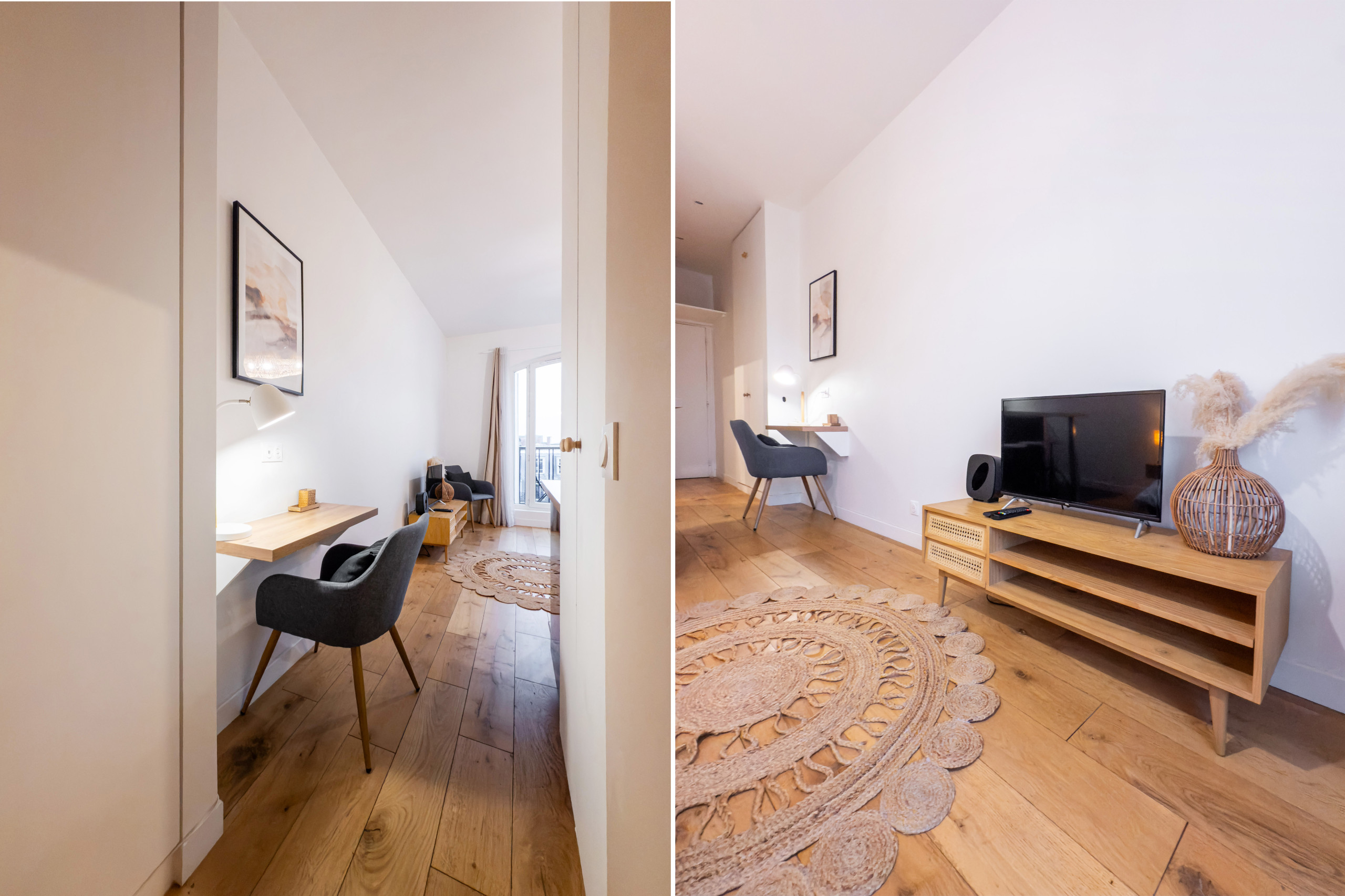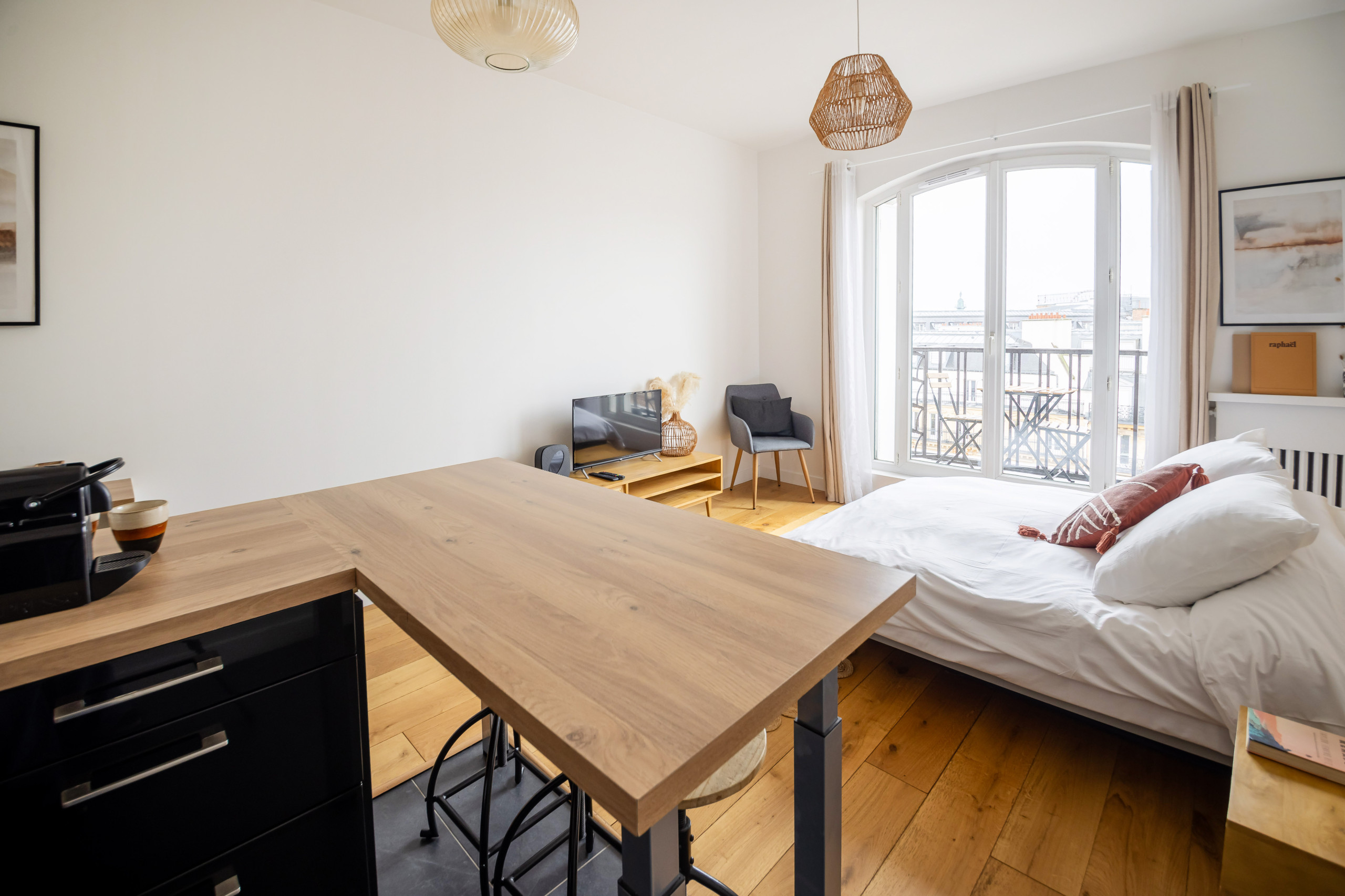 Bienvenue dans ce studio parfaitement agencé, idéal pour un séjour confortable au cœur de Paris. Situé au deuxième étage d’un immeuble typiquement parisien (sans ascenseur), il offre un cadre chaleureux et fonctionnel. Il dispose d’un lit Queen Size avec une très bonne literie, garantissant des nuits reposantes. Les espaces ont été optimisés pour accueillir aussi bien un voyageur solo, un couple ou un déplacement professionnel.