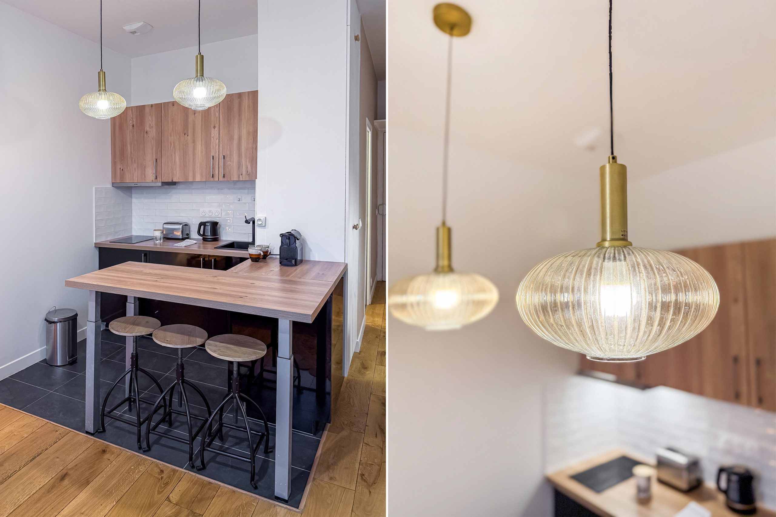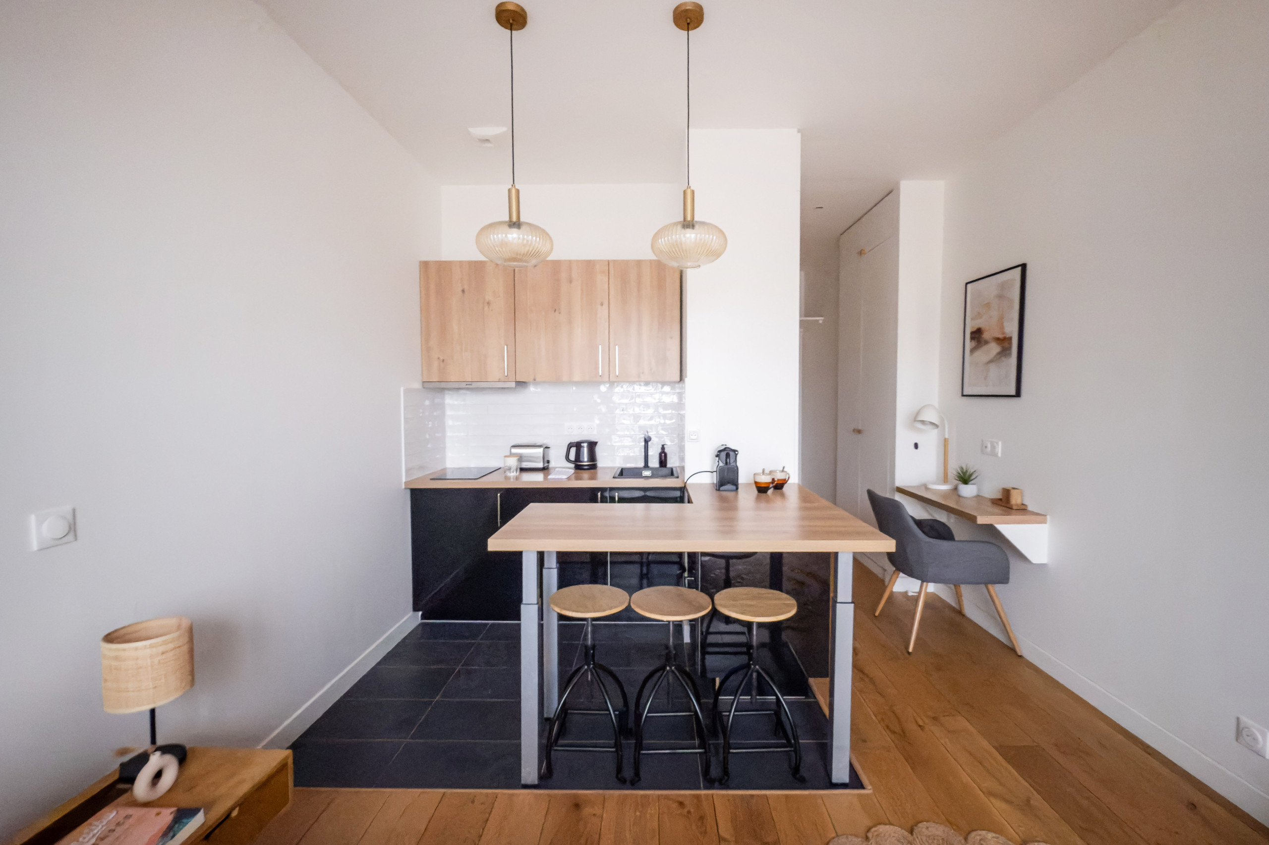 La cuisine ouverte est entièrement équipée et aménagée : un large plan de travail, un espace repas pour deux personnes, un lave-vaisselle, un micro-ondes, une cafetière, une bouilloire, un grille-pain et tout le nécessaire pour préparer vos repas comme à la maison.