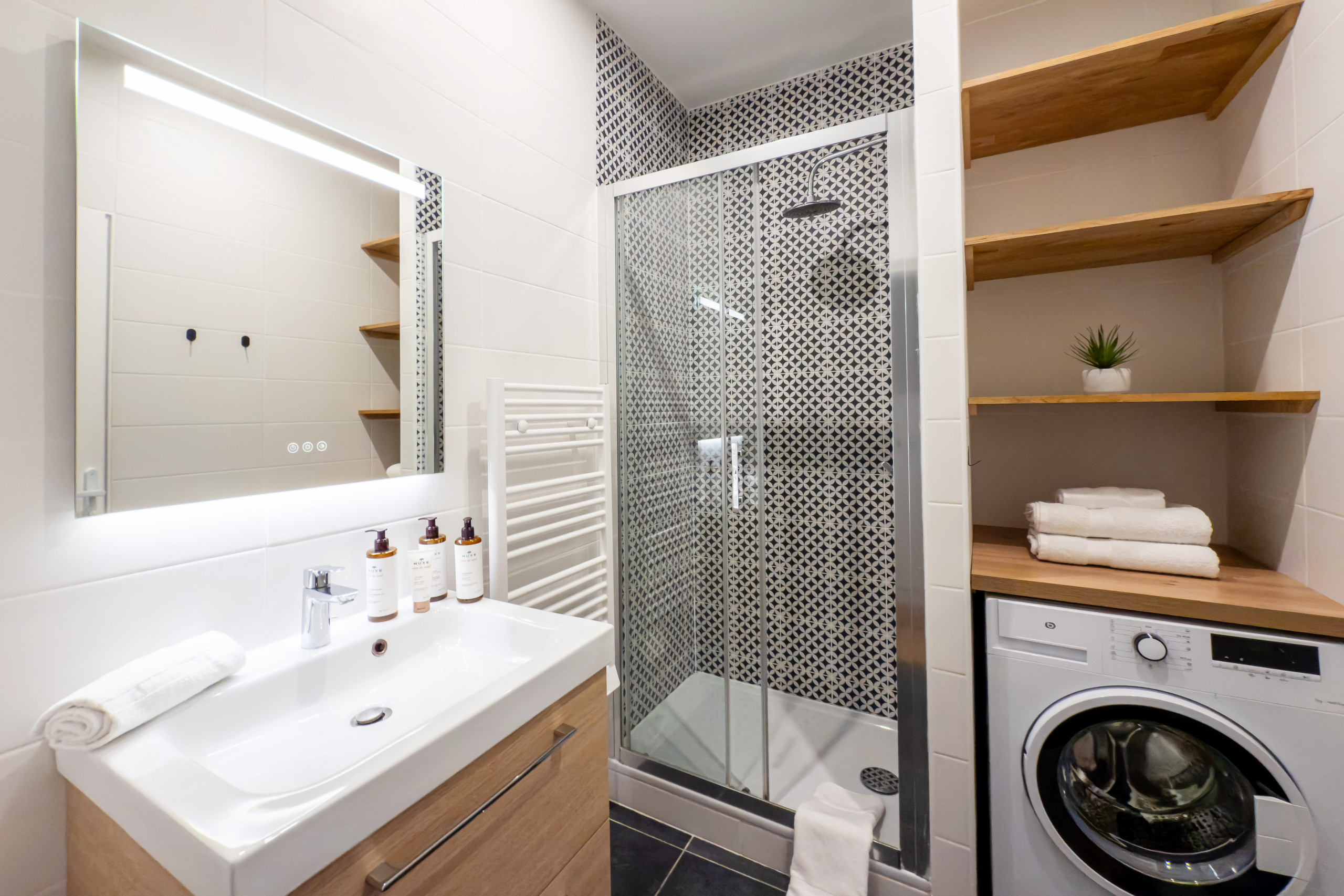 Le studio est également doté d’une Smart TV pour vos moments de détente. La salle de douche moderne comprend des WC ainsi qu’un lave-linge, pratique pour les séjours prolongés.