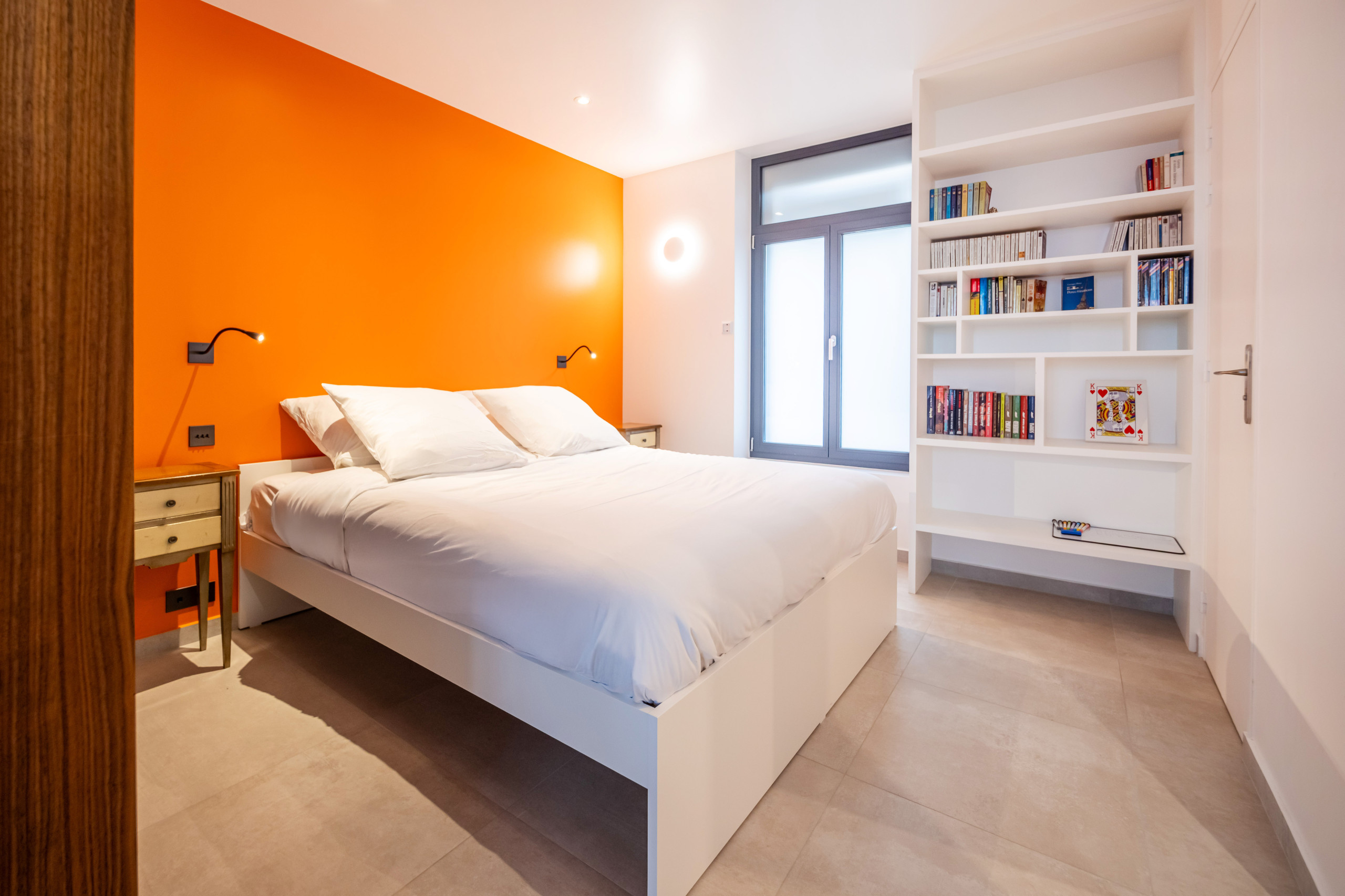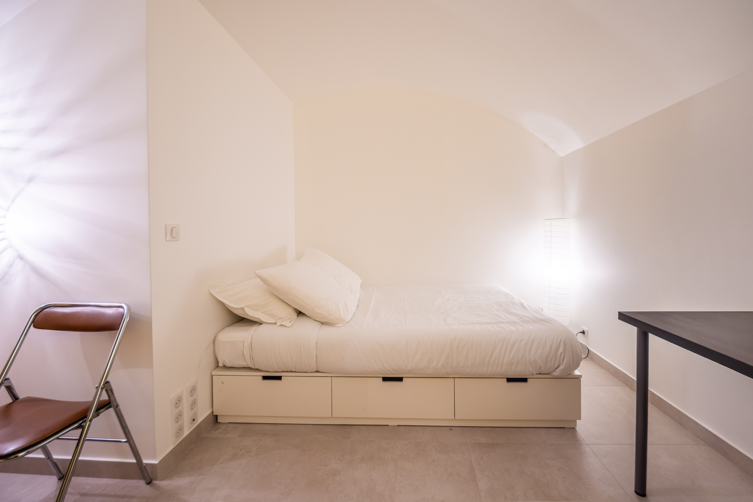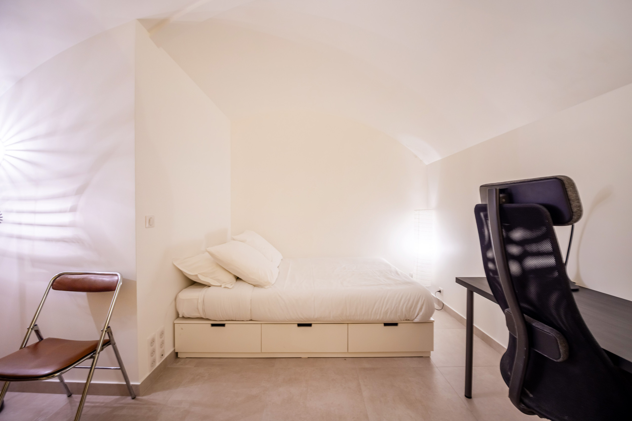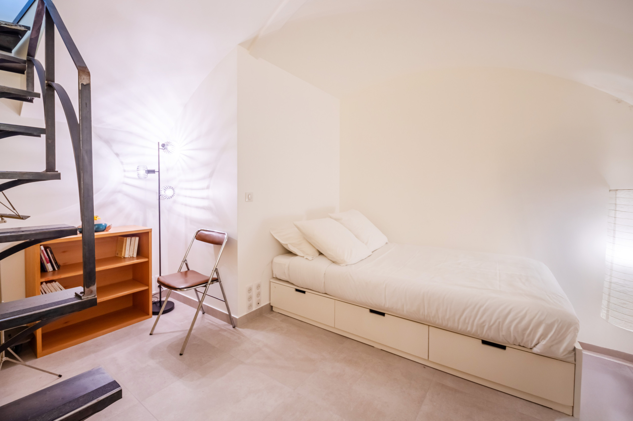 La chambre à coucher, paisible et donnant sur la cour, est équipée d'une grande armoire et d'un lit spacieux (200x160cm) pour des nuits reposantes. La salle de bain, d'un design très moderne, est revêtue d'ardoise et dispose d'une douche à l'italienne.