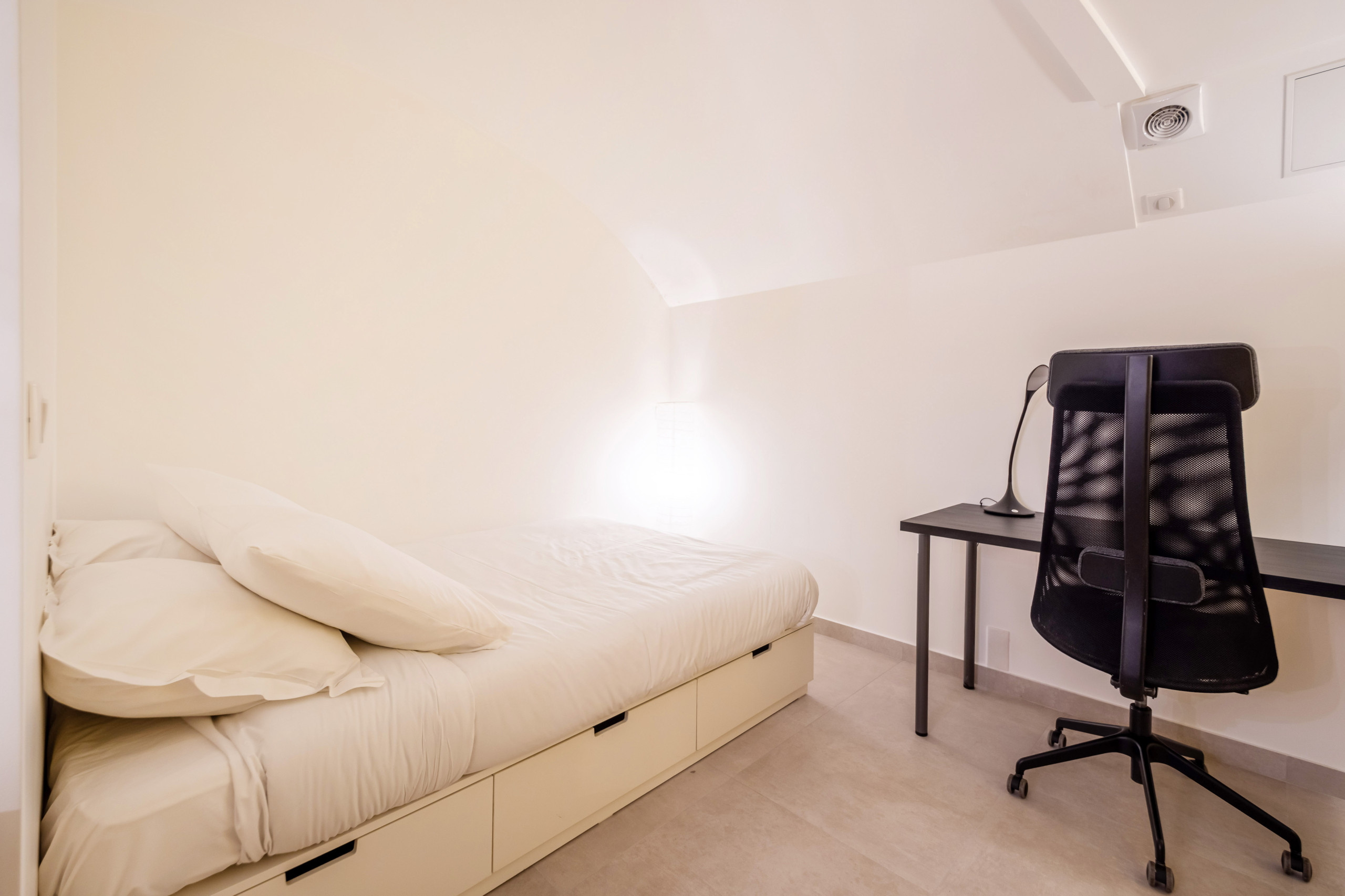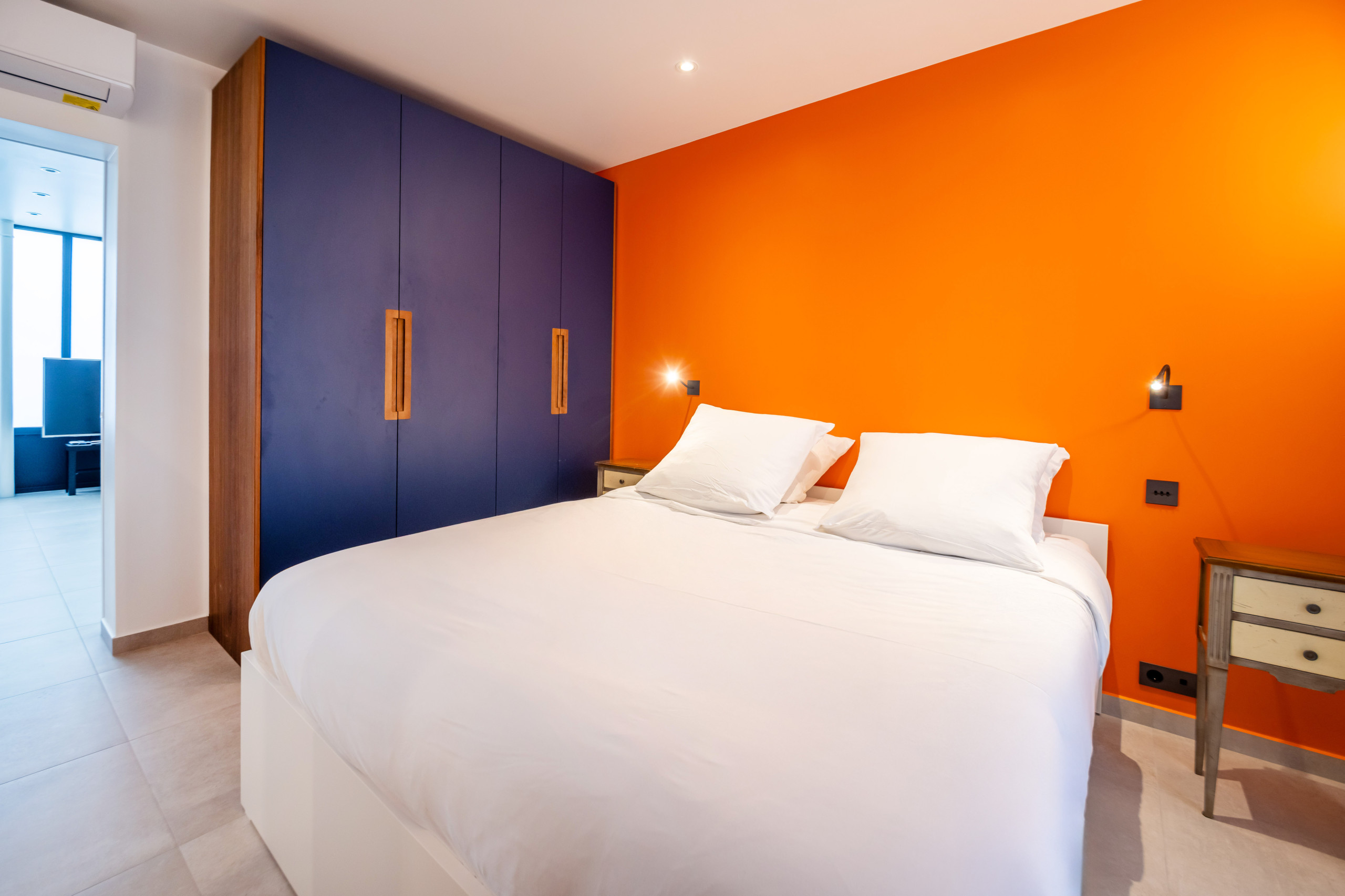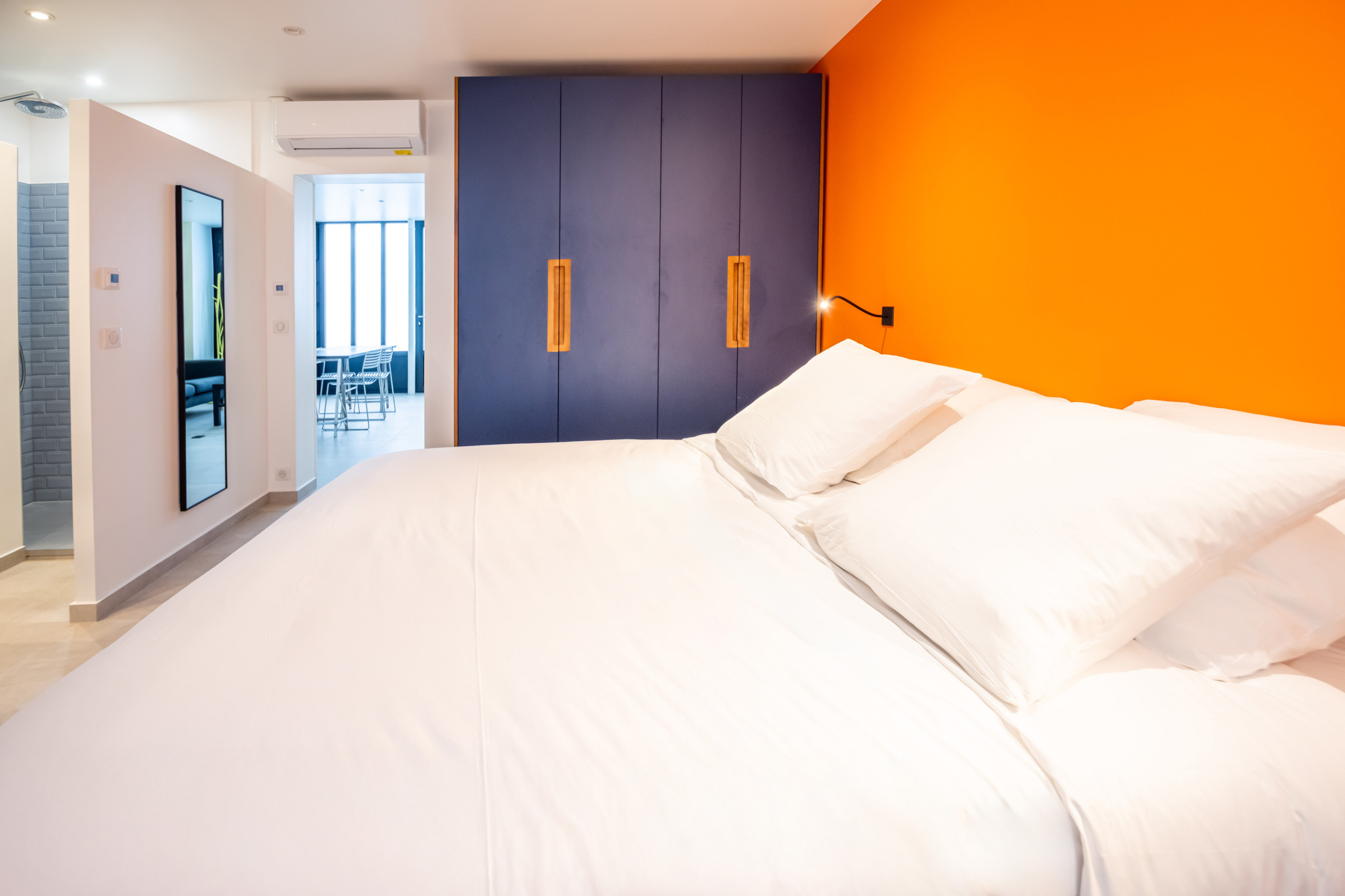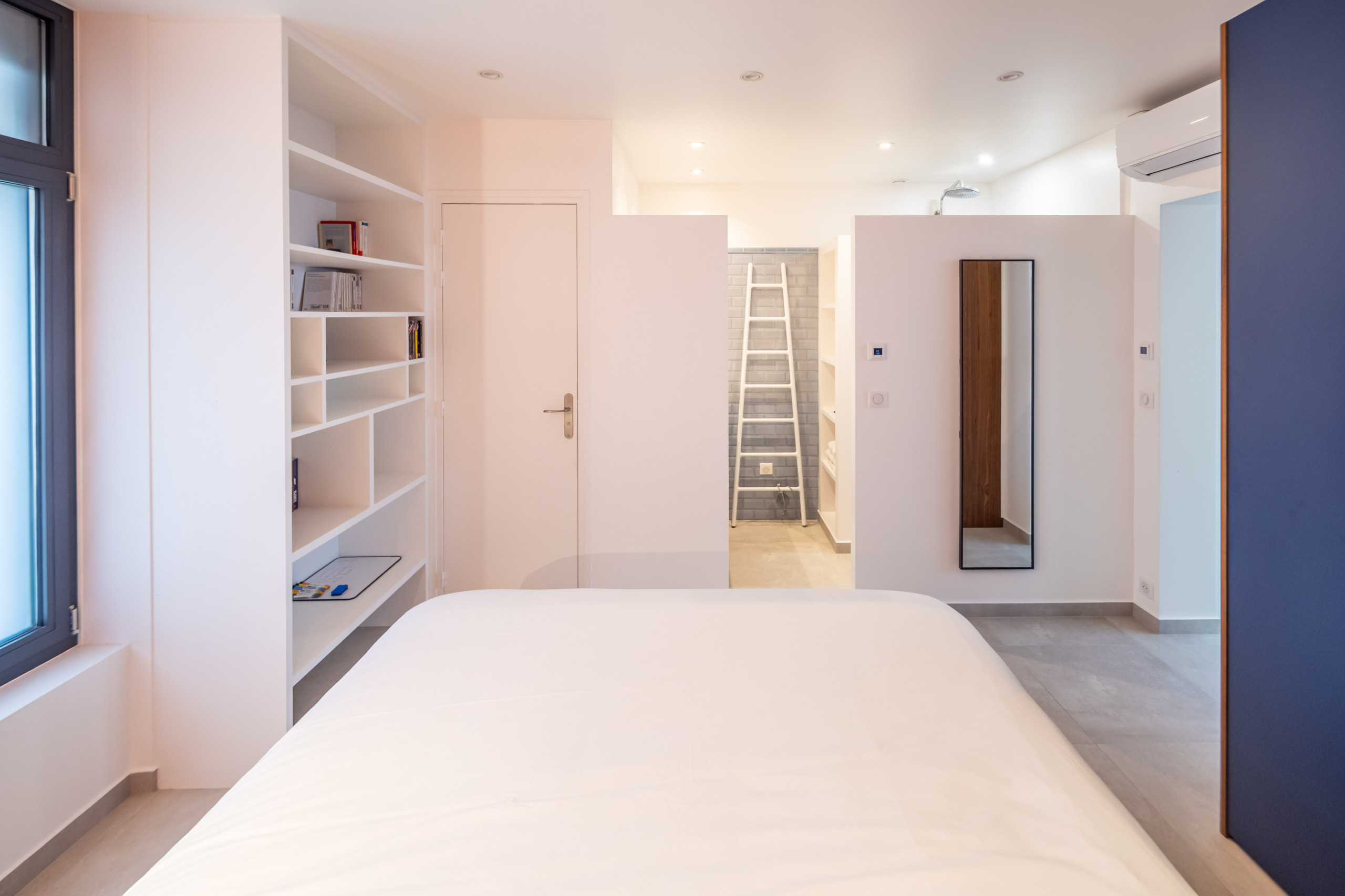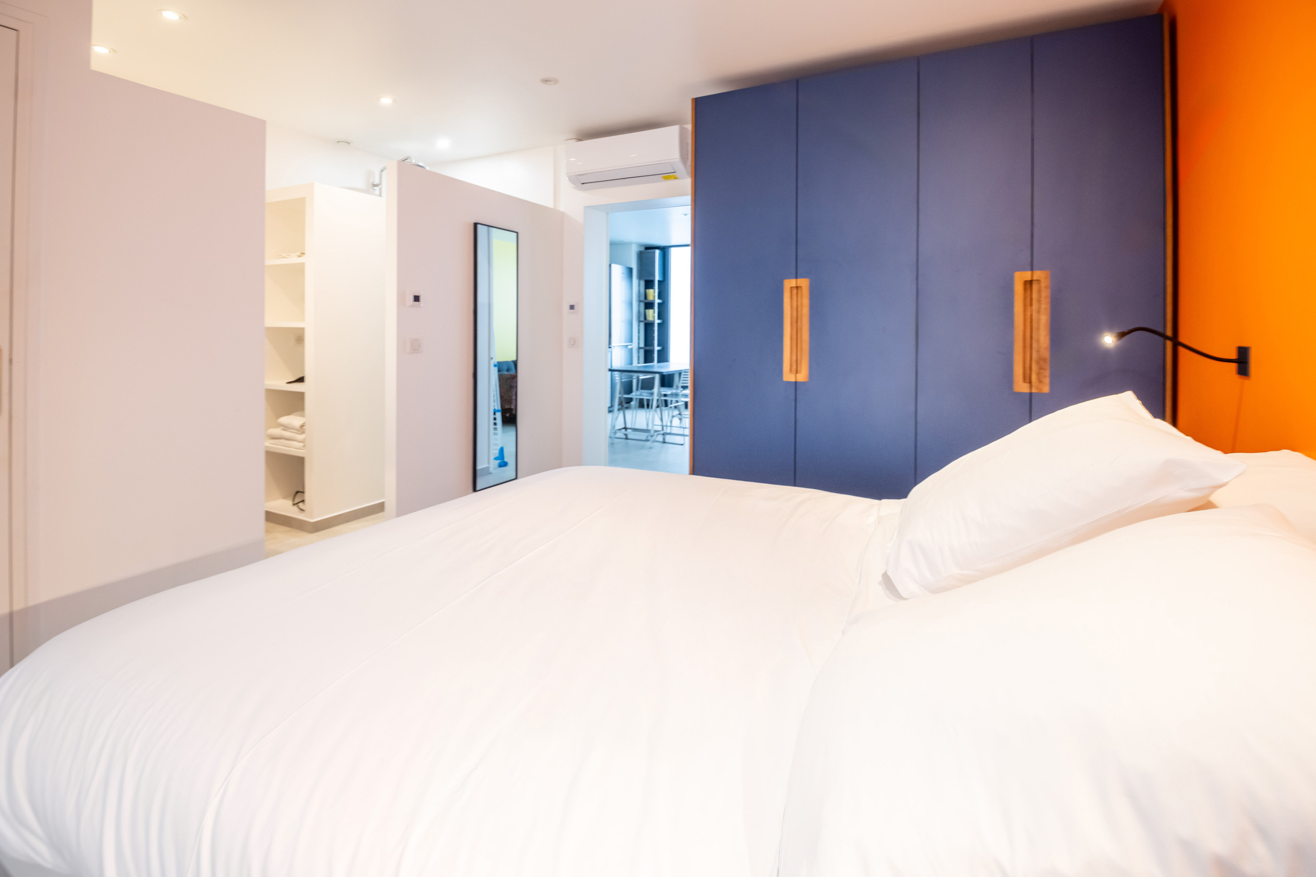 La chambre à coucher, paisible et donnant sur la cour, est équipée d'une grande armoire et d'un lit spacieux (200x160cm) pour des nuits reposantes. La salle de bain, d'un design très moderne, est revêtue d'ardoise et dispose d'une douche à l'italienne.