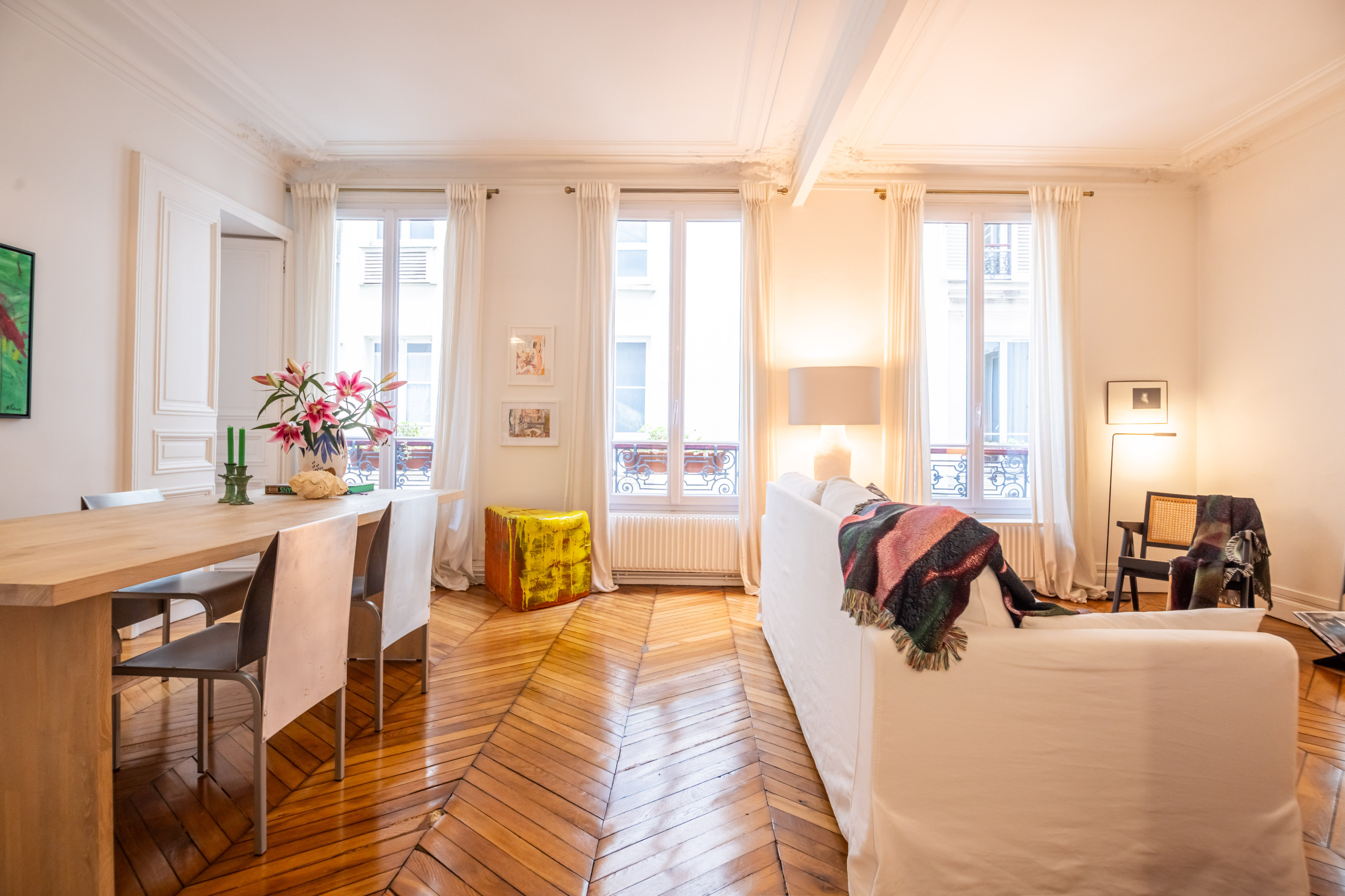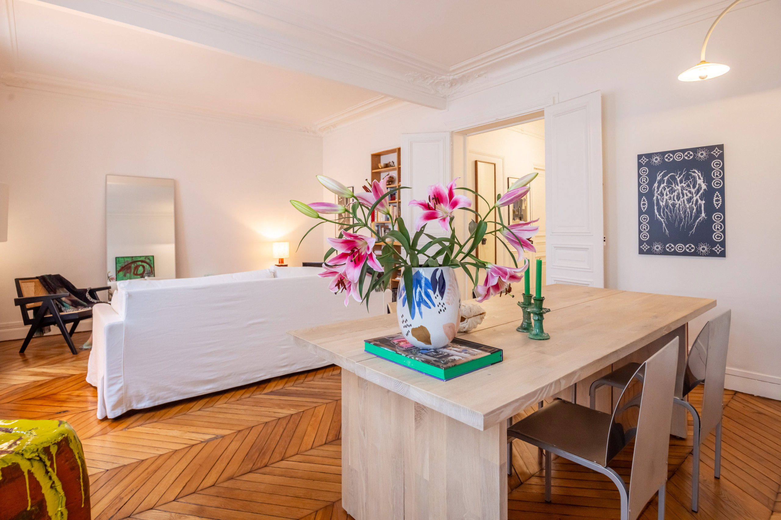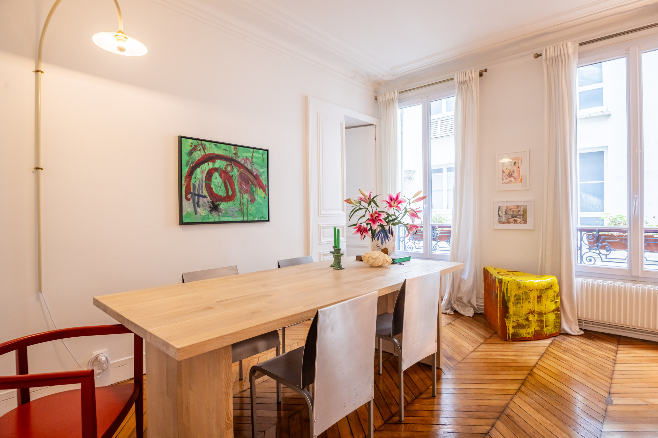 The space features original hardwood floors, elegant moldings, and a sleek, minimalist design. The cozy living room invites you to relax with its comfortable sofa and a curated library of books. A large dining table seats up to six guests, perfect for sharing a meal after a day exploring Paris.