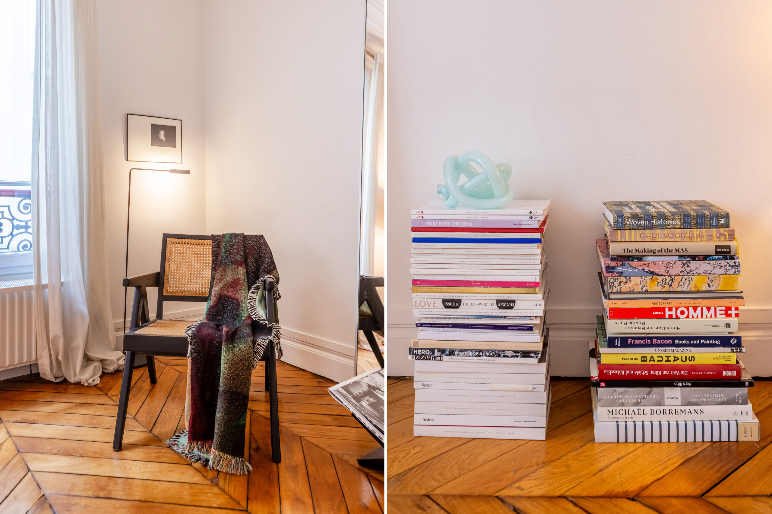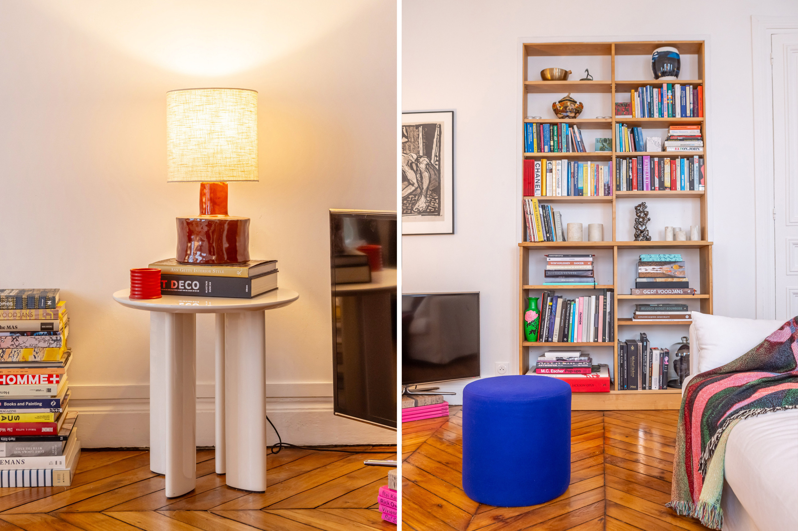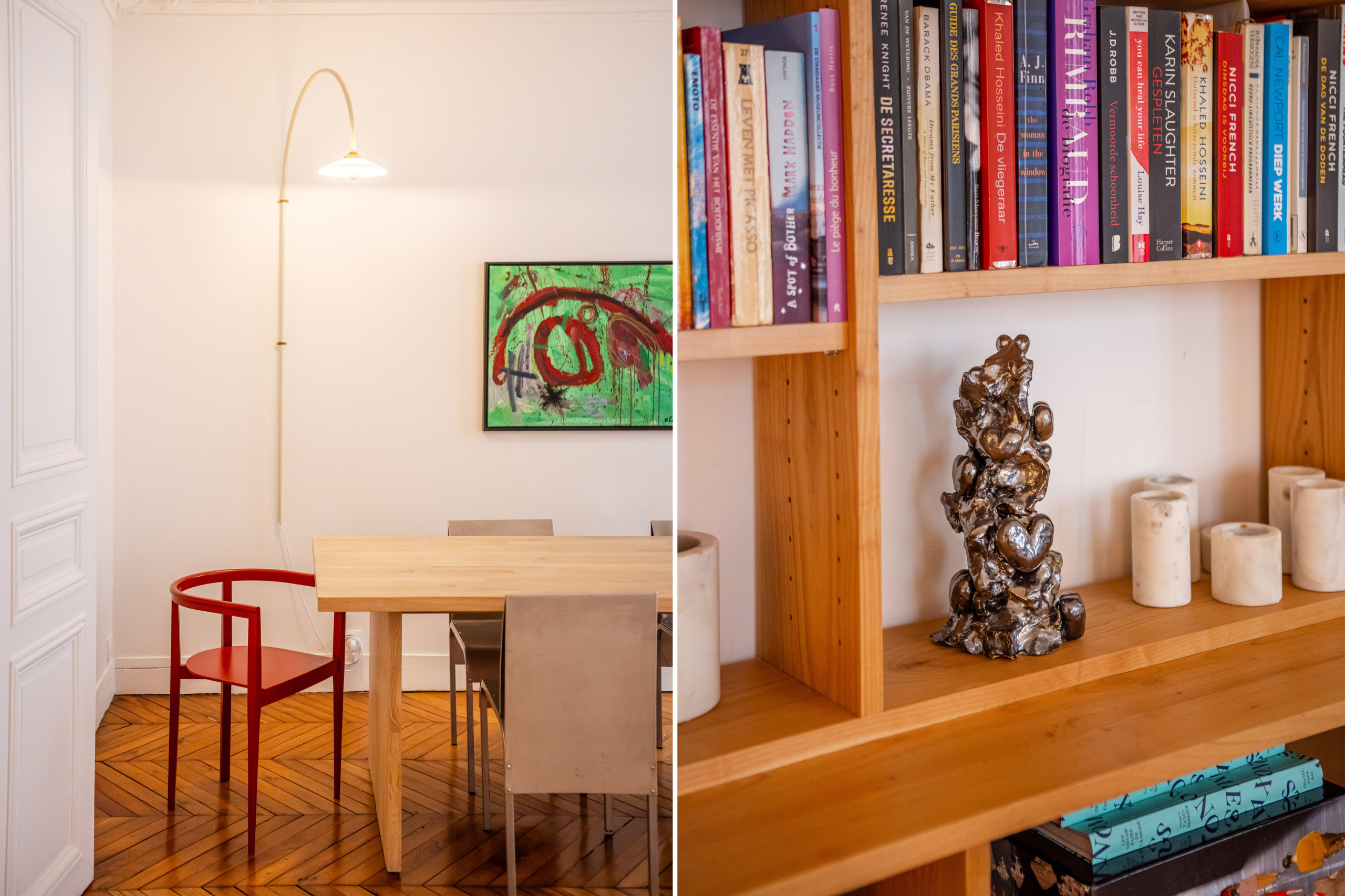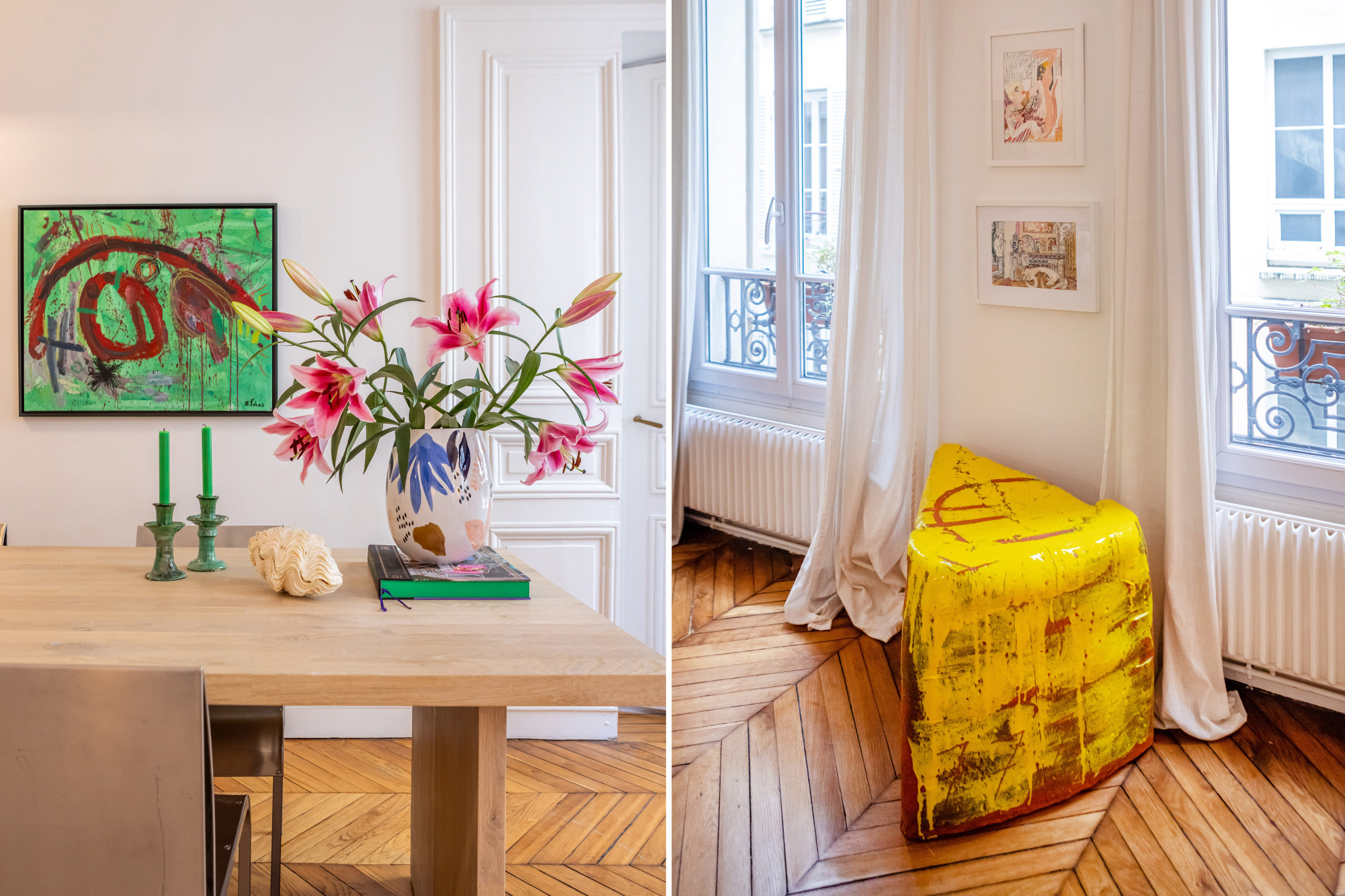 The space features original hardwood floors, elegant moldings, and a sleek, minimalist design. The cozy living room invites you to relax with its comfortable sofa and a curated library of books. A large dining table seats up to six guests, perfect for sharing a meal after a day exploring Paris.