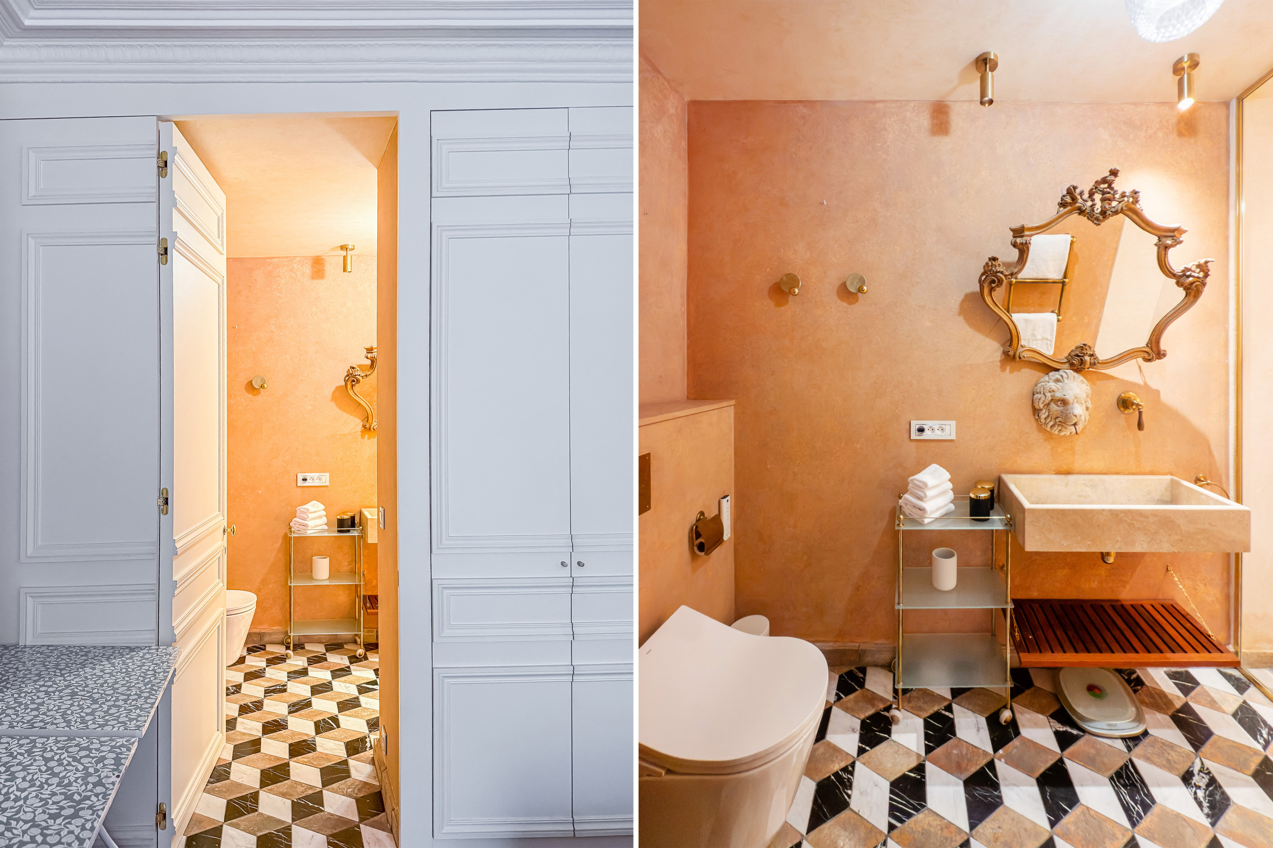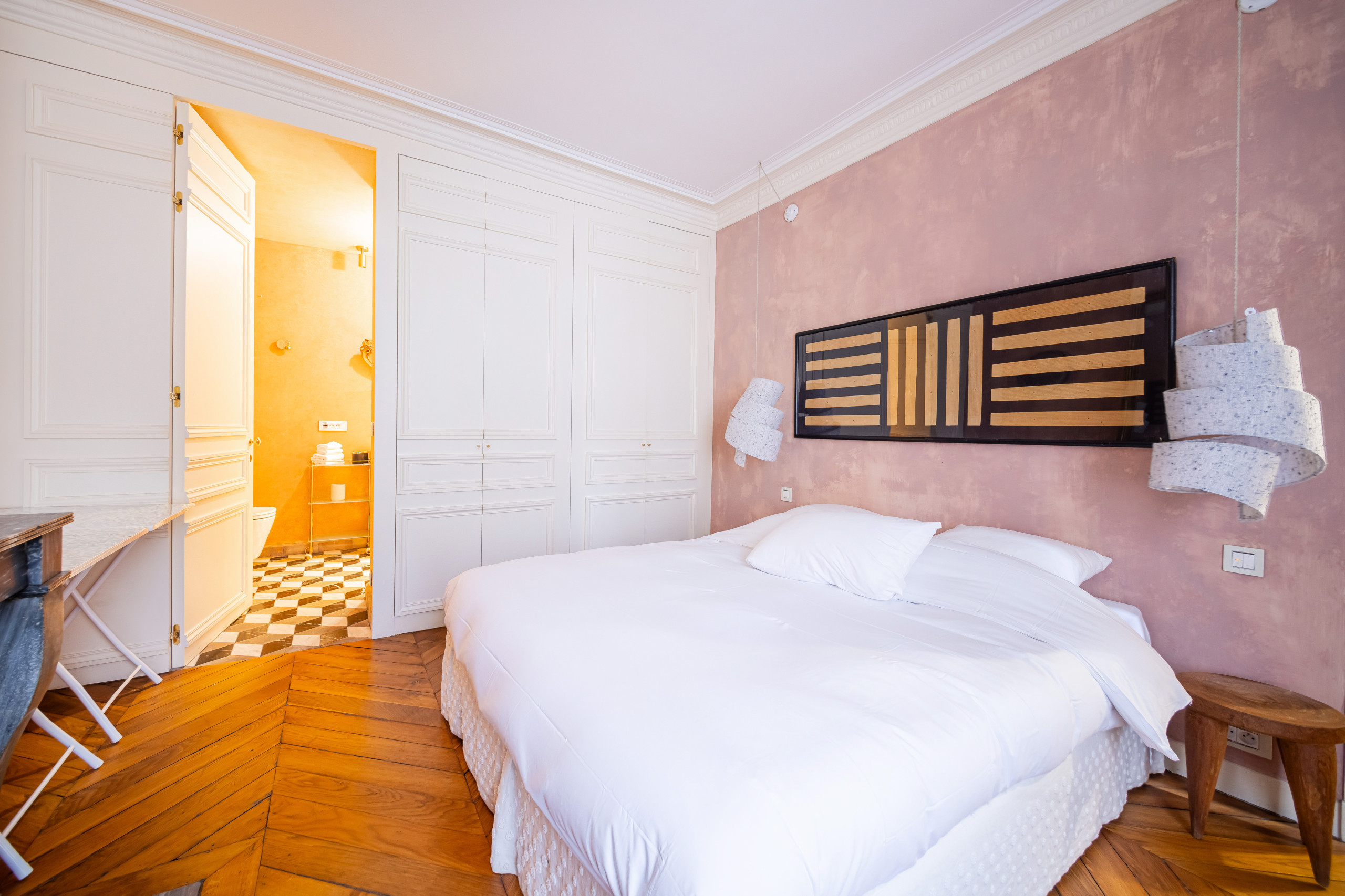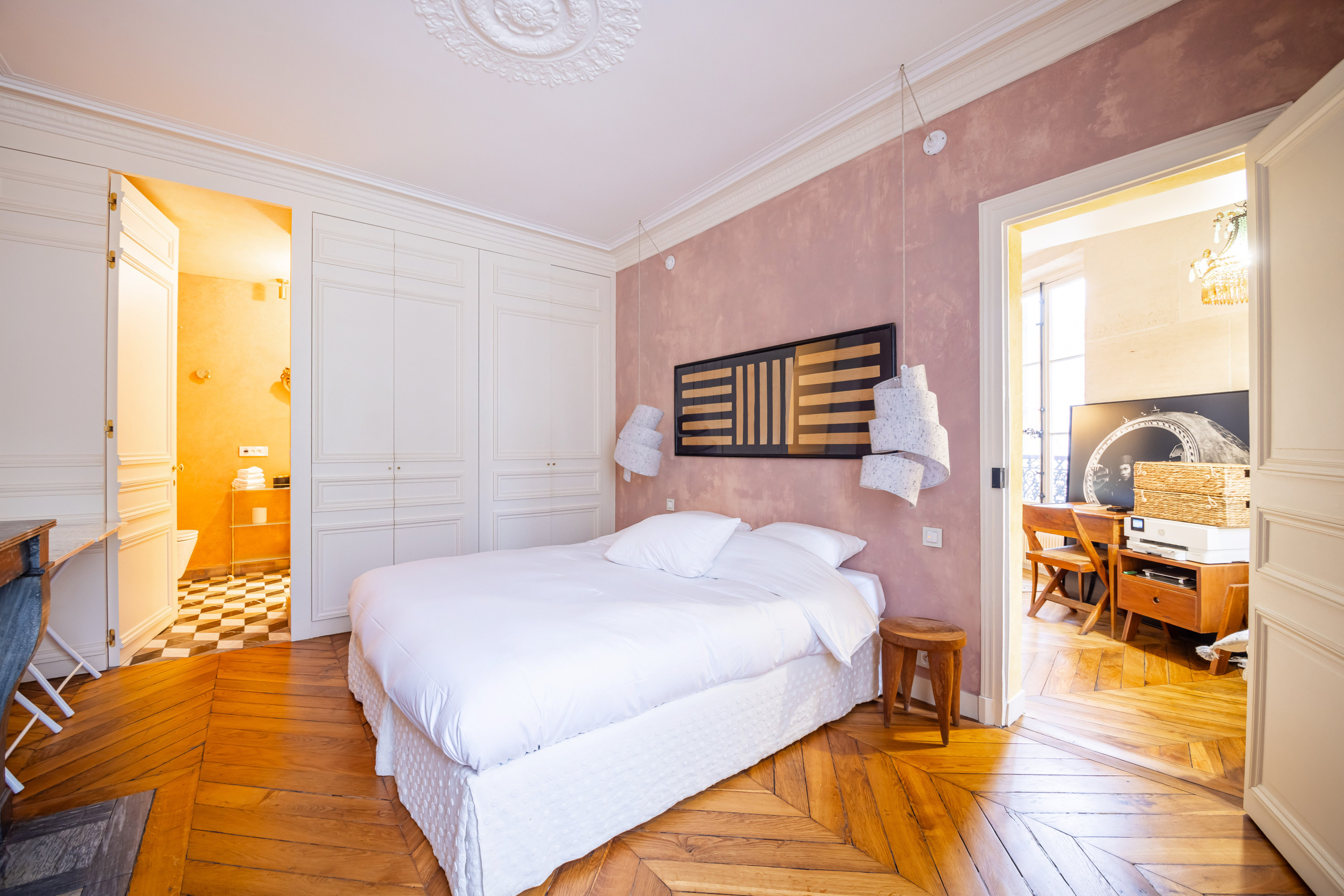 The apartment features two stylish suites, each with a king-size bed, an en-suite bathroom with WC, and generous closet space. One suite also includes a desk and library area, perfect for remote work or quiet reading.