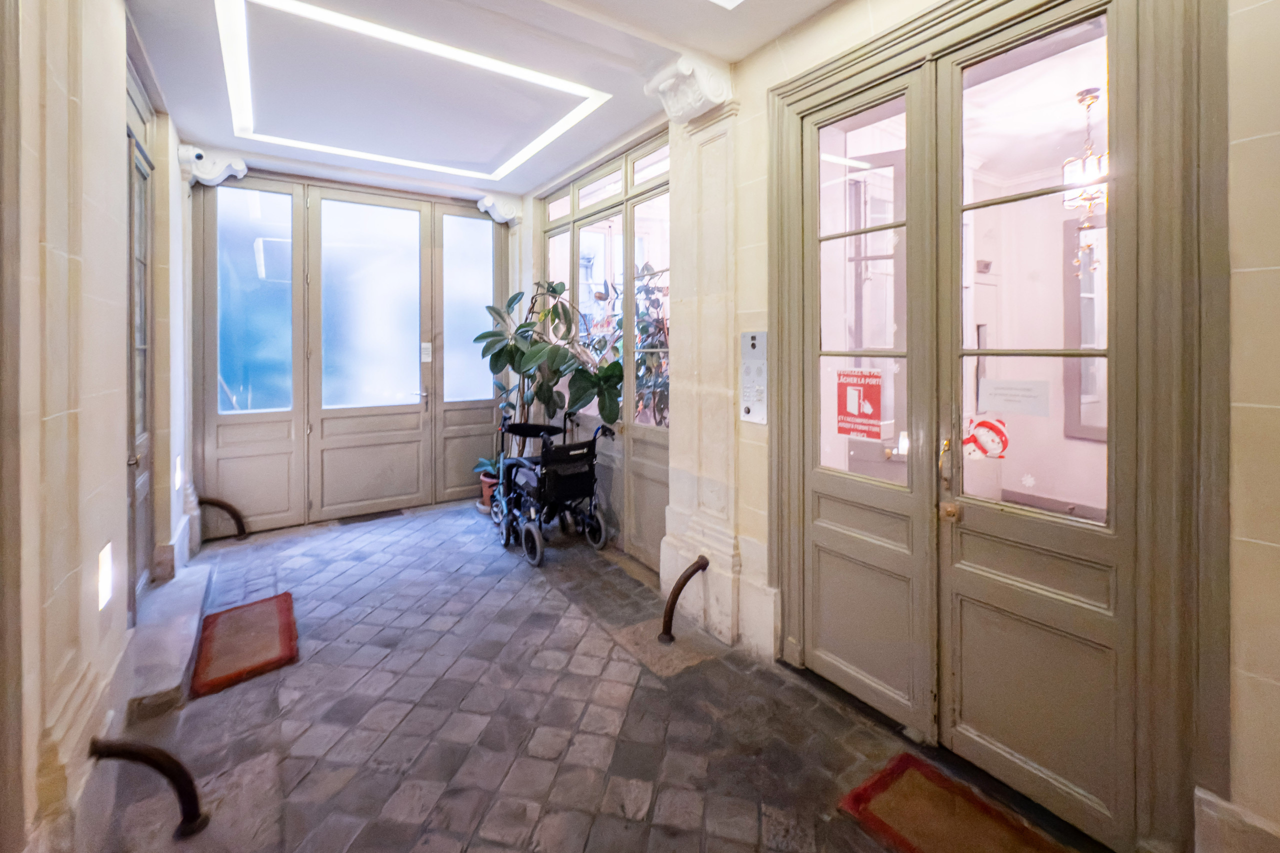 It is located on the 2nd floor of a building without elevator. It is surrounded by restaurants, bars, bakeries, markets, shops and the nearest metro station is Saint Paul which is 2 blocks away on Rue de Rivoli.