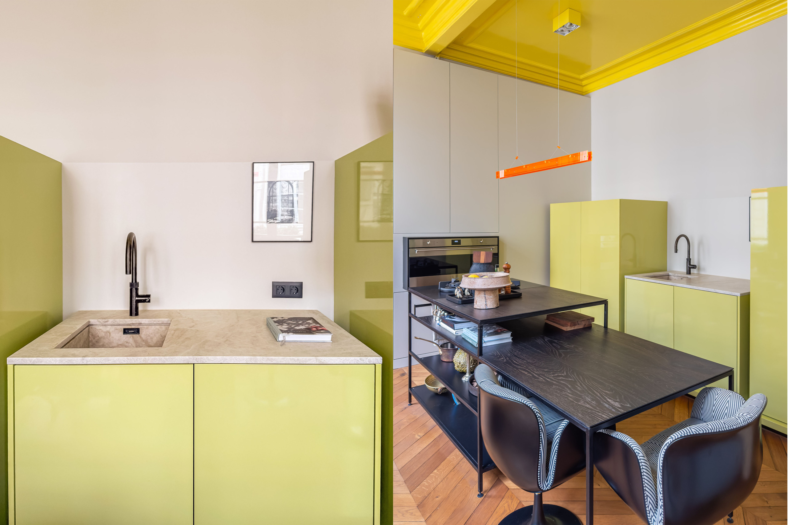 The kitchen is separate, minimalist, and fully equipped with premium appliances, featuring a dining area for two in a refined and functional setting.