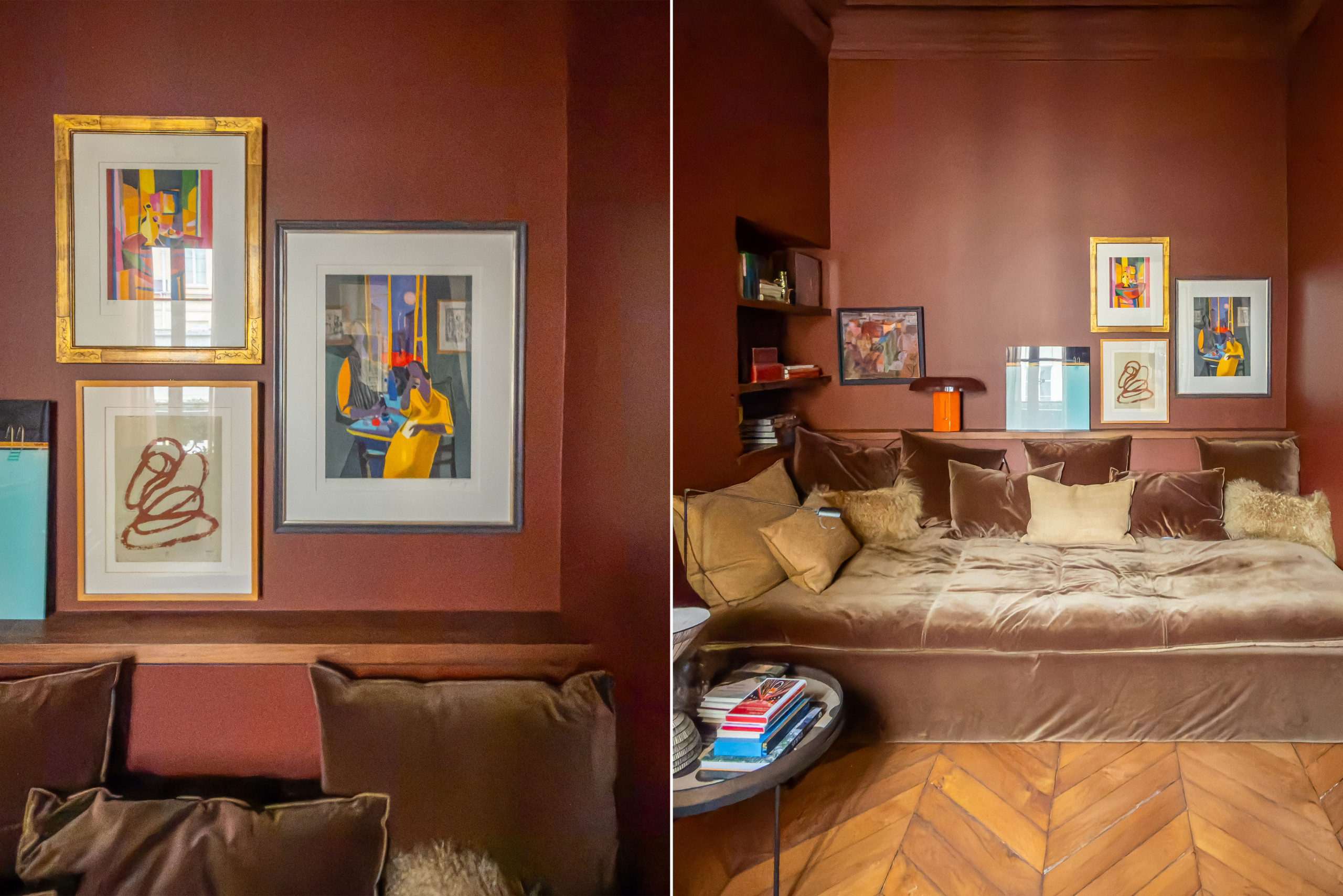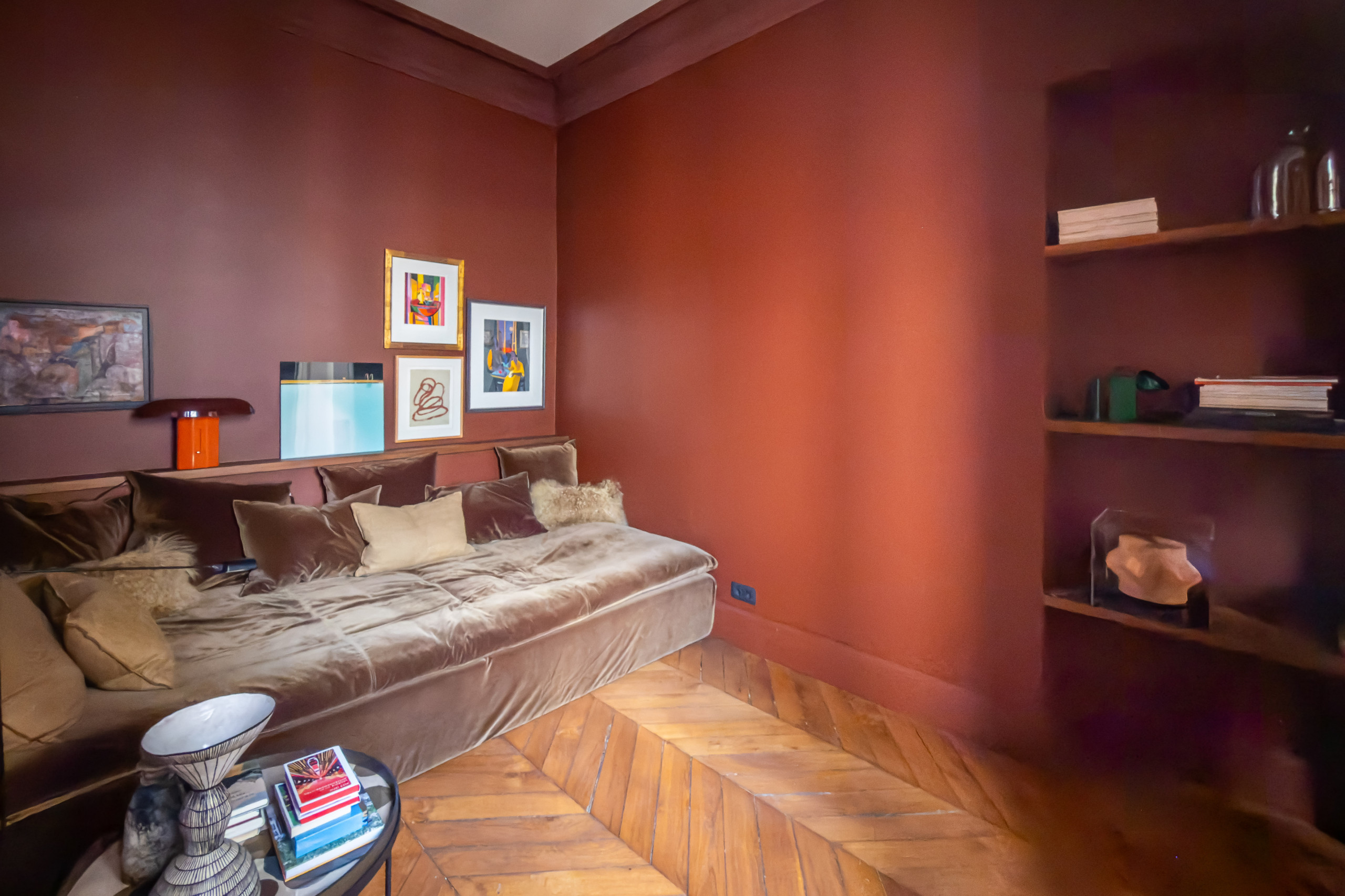 The main bedroom features a king-size bed (180x200 cm), a spacious walk-in dressing area, and a calm, sophisticated ambiance. A second room, designed as a boudoir or guest space, offers an oversized sofa (3m x 1.20m), an armchair, and a side table — ideal for lounging or accommodating visitors.
